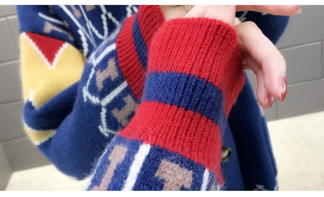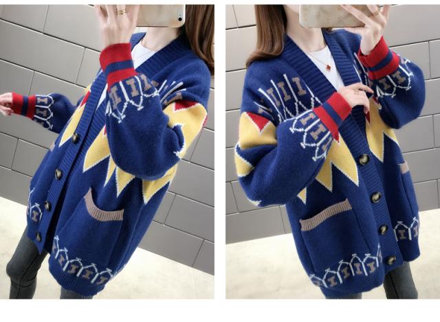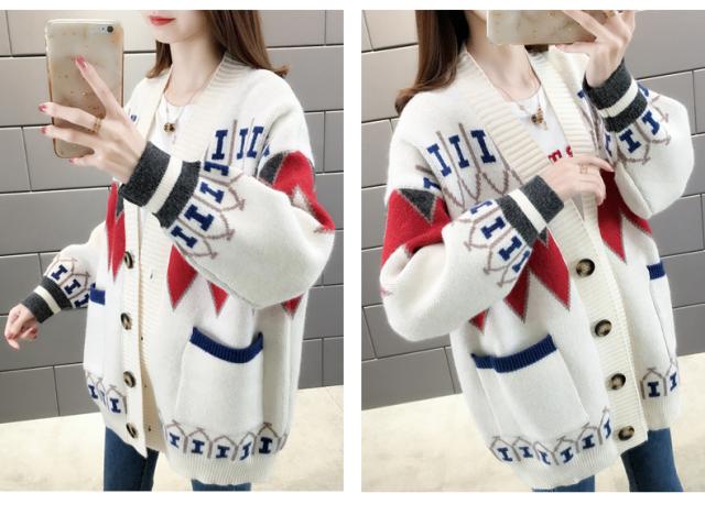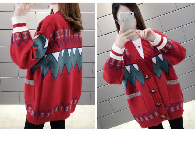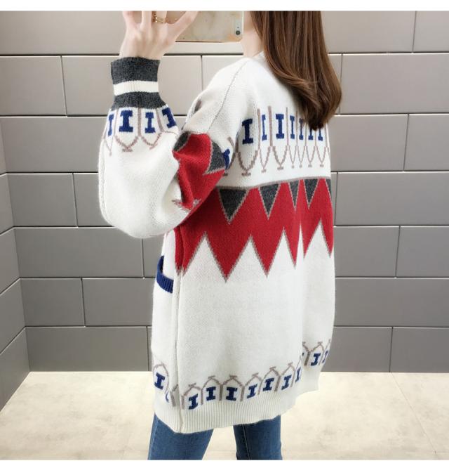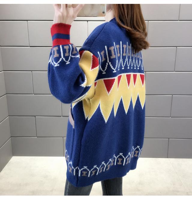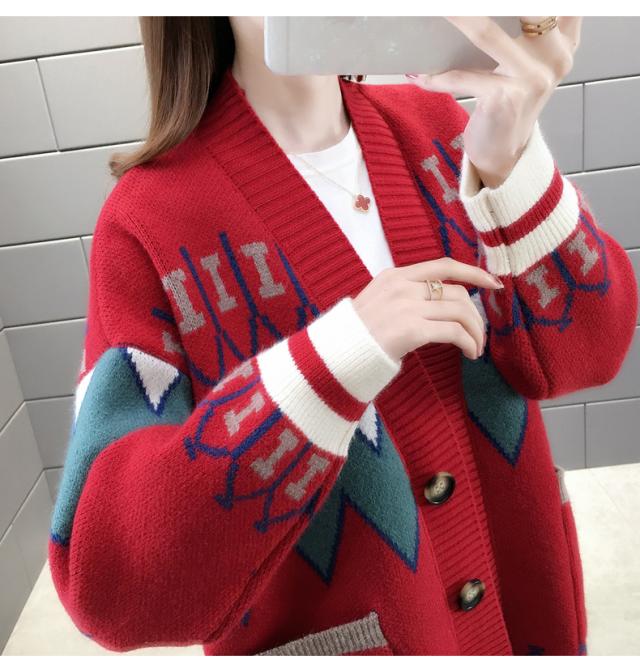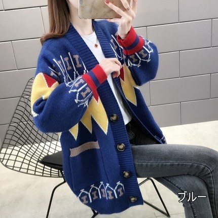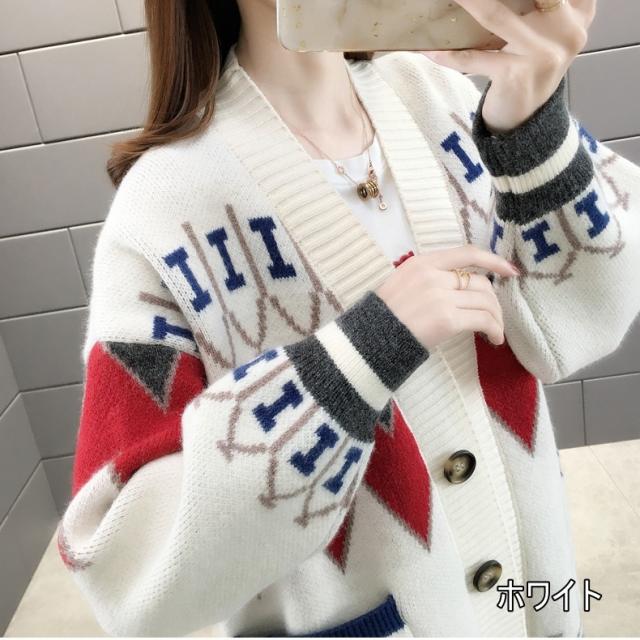 トップス ニット カーディガン 3色 ノルディック 長袖 レディース ゆったり 前開き ボタン シンプル カジュアル ラフ 総柄 ホワイト 白 赤 レッド 青 ブルー ルーズ ゆる リラックス 萌え袖 休日 お出かけ 公園 体型カバー 着痩せ 細見え 20代 30代 40代 50代 60代 春 秋 冬