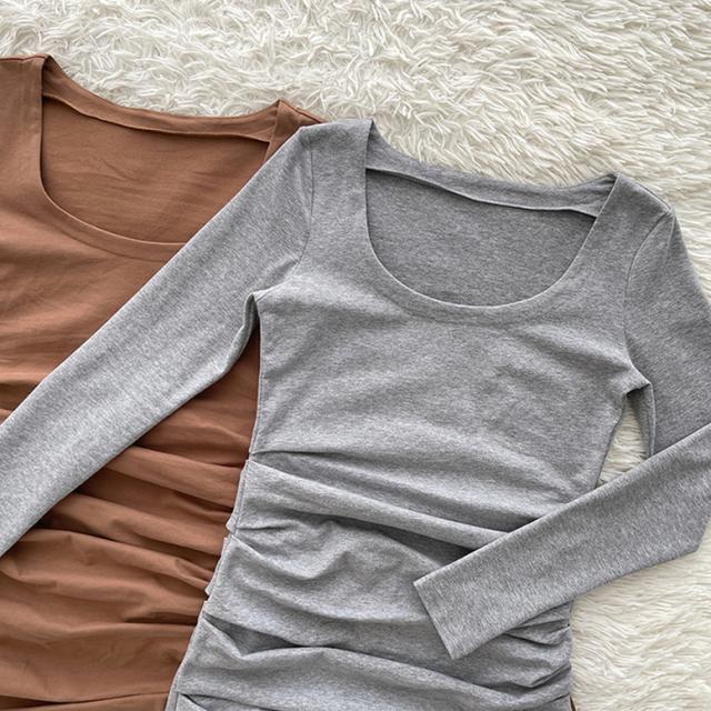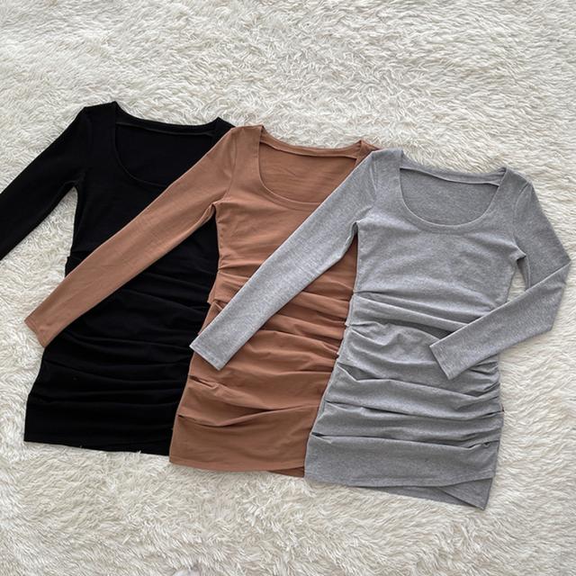 ミニワンピース ギャザータイトシャツワンピース レディース ワンピース タイトワンピース ギャザー ラウンドネック 長袖 シャツワンピース Tシャツワンピ タイト フィット スリム セクシー 茶色 黒 灰色 ブラウン ブラック グレー 春 夏 秋 冬 二次会 オフィス OL 通勤 学生