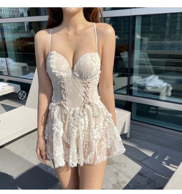 水着 スイムウエア レディース ワンピース水着 総レース レースアップ バックコンシャス リボン 肩紐 コルセット風 フレア 透け感 シアー シースルー ギャザー クロス 谷間魅せ 胸元 盛れる かわいい 大人可愛い きれいめ セクシー sexy ゴージャス 華やか おしゃれ お洒落