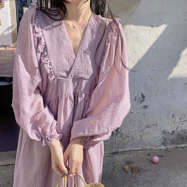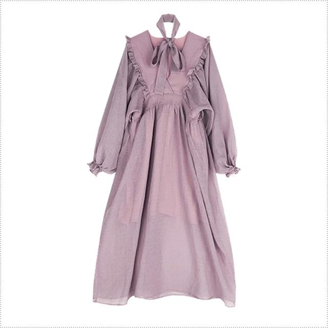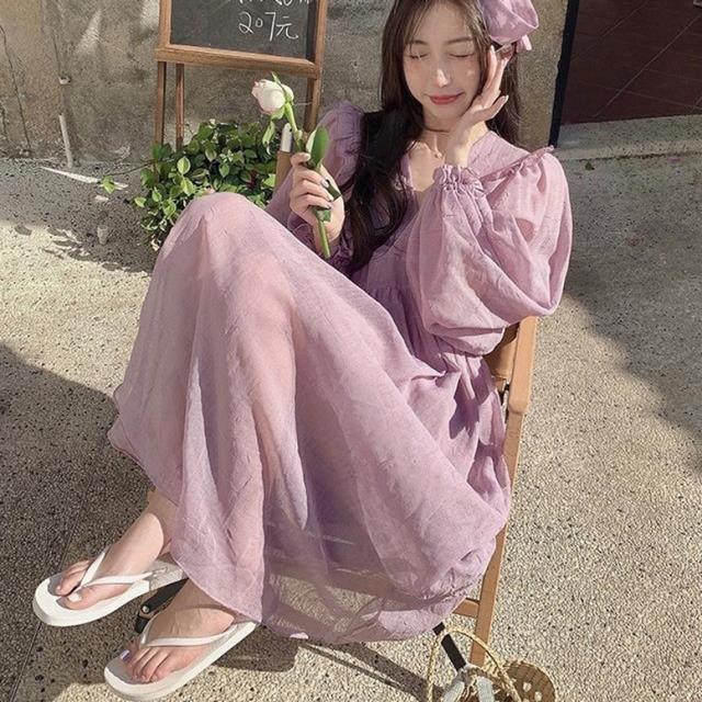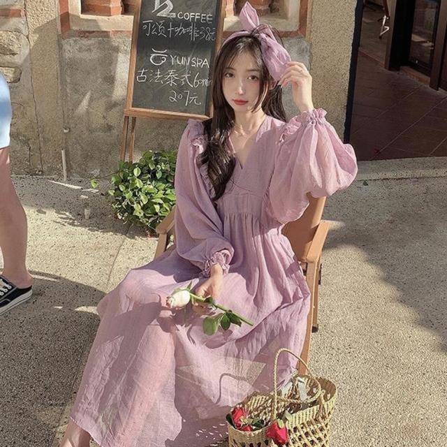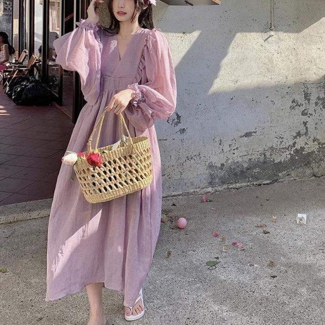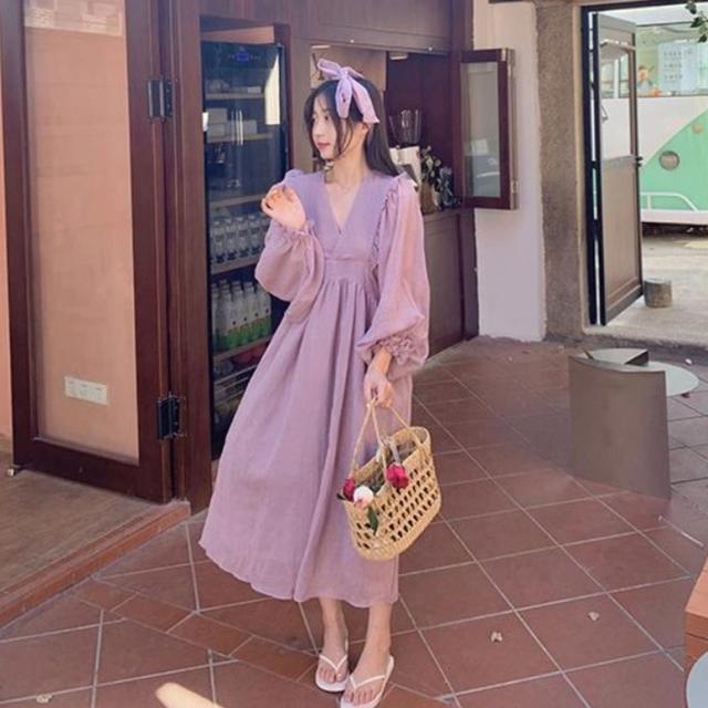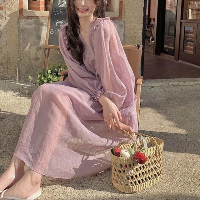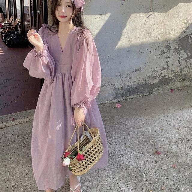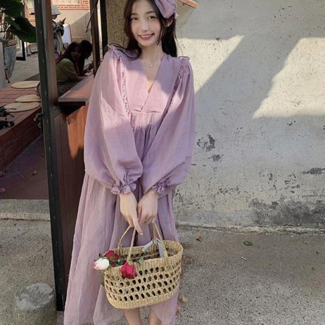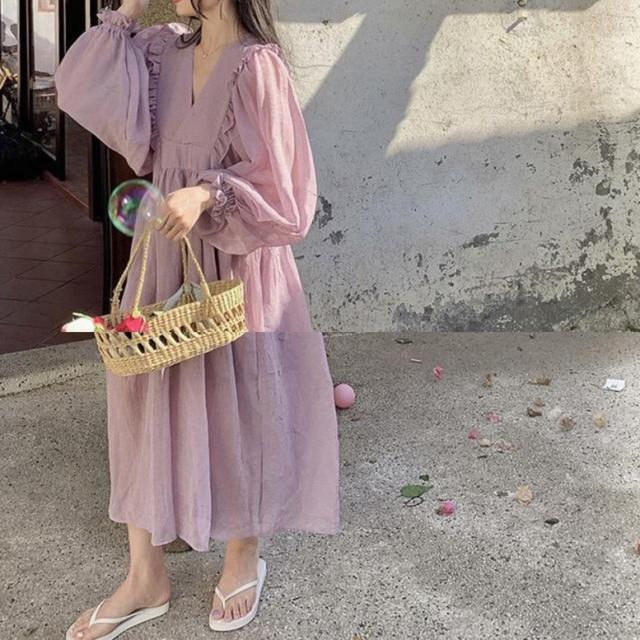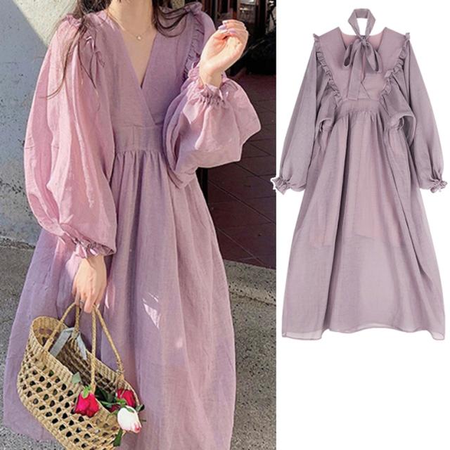 ロングワンピース カシュクールフリルオーバーワンピース レディース ワンピース マキシワンピース フレアワンピース カシュクールワンピース ミモレ丈 ロング丈 ボリュームスリーブ 長袖 Vネック ハイウエスト フリル フェミニン 紫 パープル 大人可愛い きれいめ 上品 エレガント ガーリー ルーズ 大人女子 おしゃれ 春 夏 秋 冬 二次会 オフィス 通勤 通学 デート お出かけ パーティー イベント 体型カバー モテ 普段使い トレンド オーバーサイズ ゆったり インスタ映え くすみカラー
