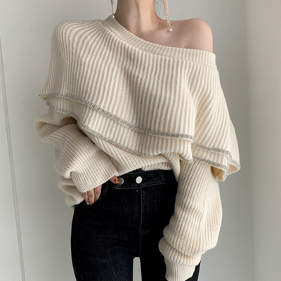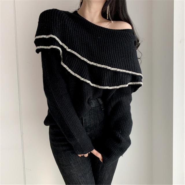トップス ニット 2色 オフショルダー ワンショルダー アシンメトリー フリル 長袖 レディース きれいめ セクシー エレガント 高級感 お洒落 オシャレ かわいい 大人可愛い 10代 20代 30代 40代 シンプル カジュアル 春 秋 冬 こなれ感 休日 お出かけ 買い物 女子会 韓国