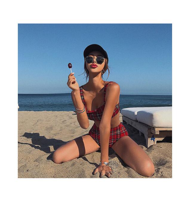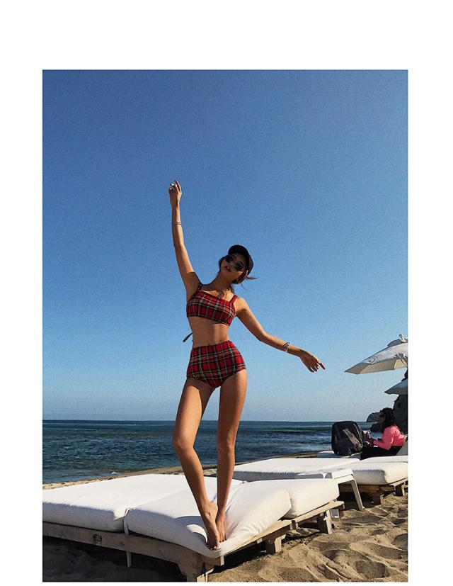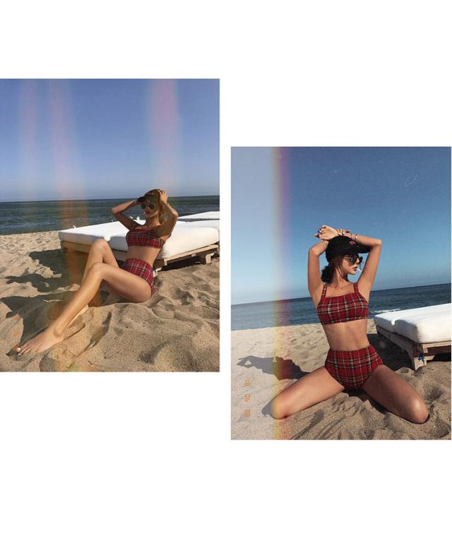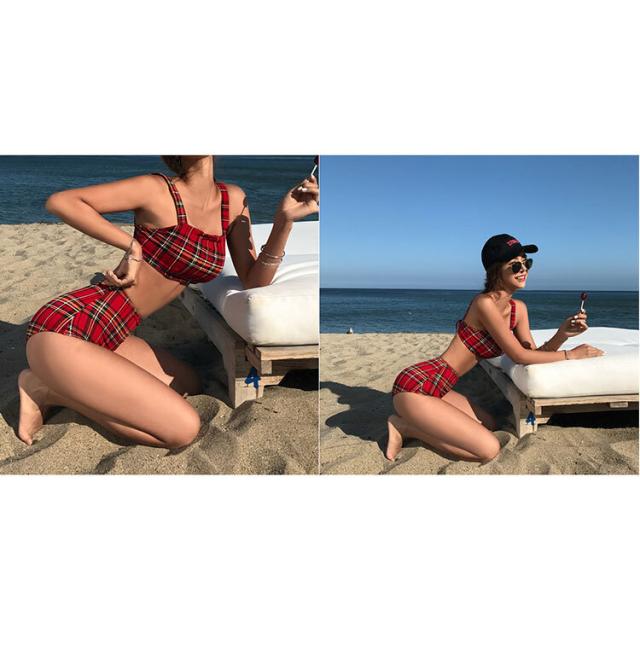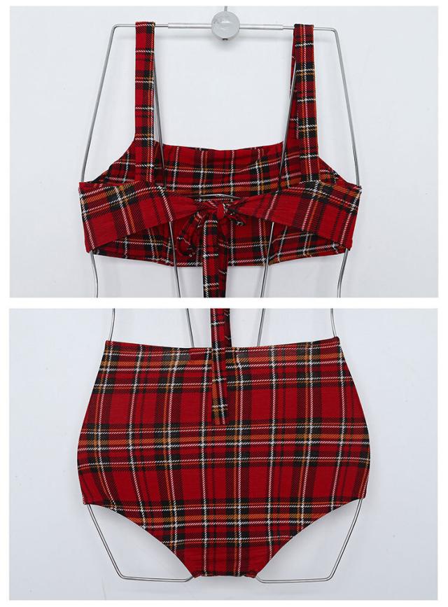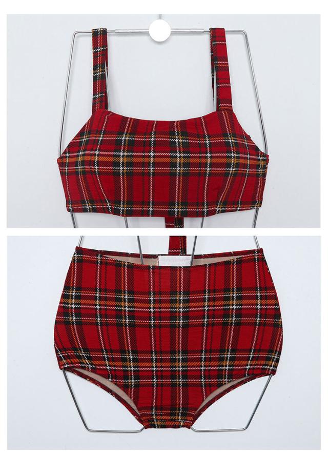 レッドベースのタータンチェック柄、セパレートタンキニ水着。