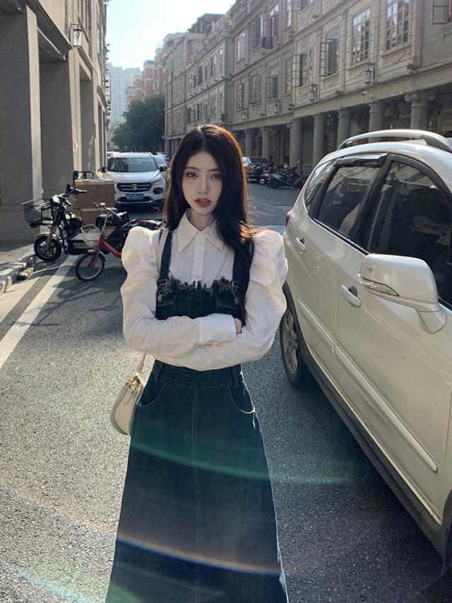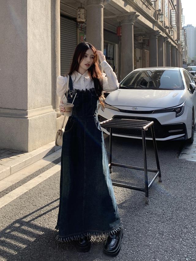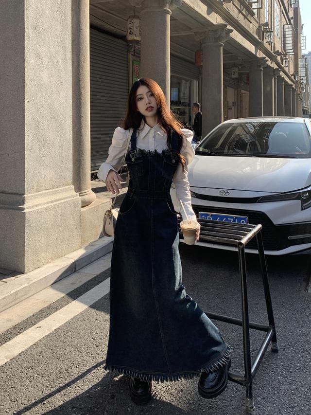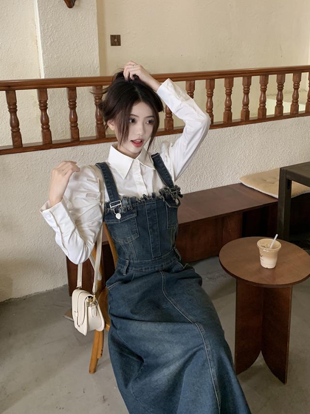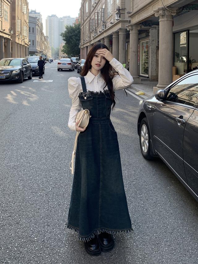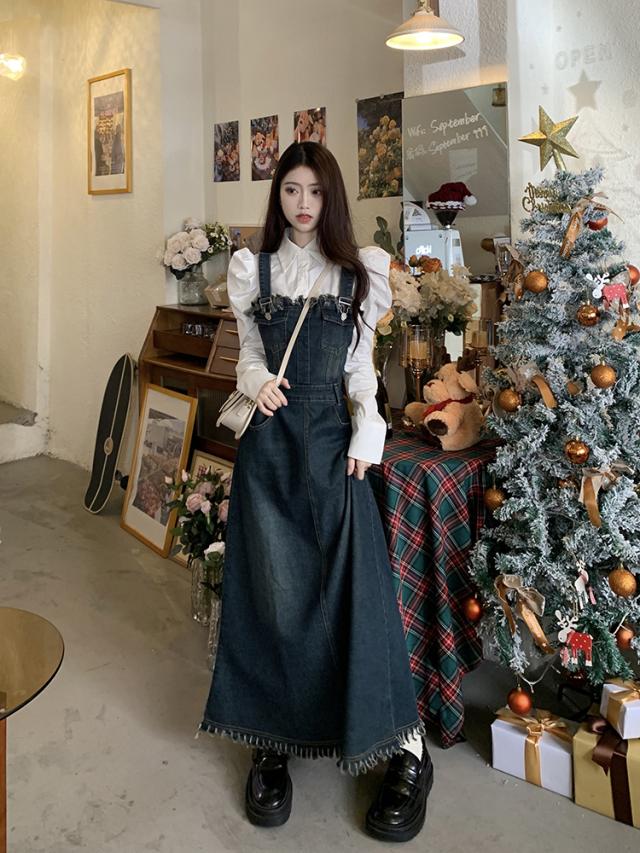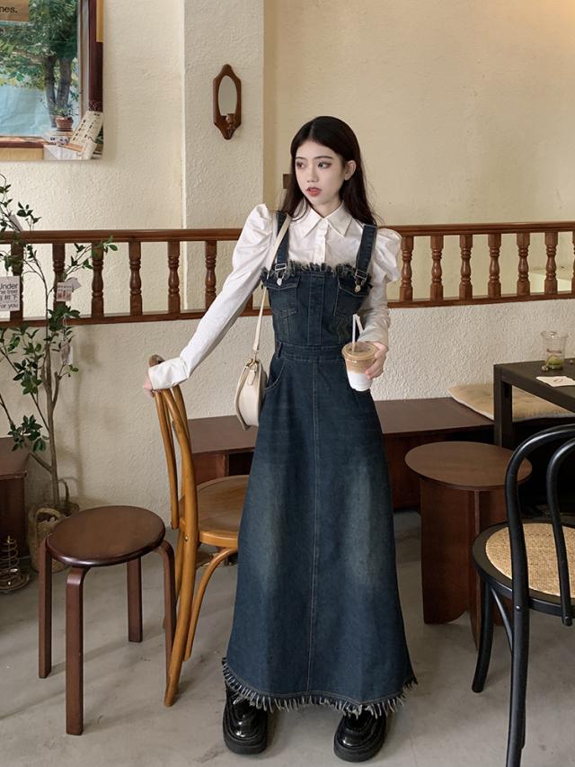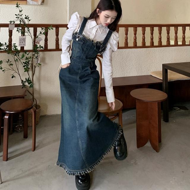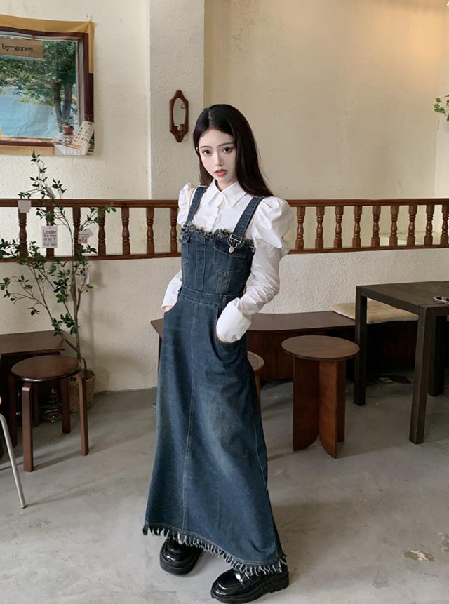セットアップ 2点セット ジャンパースカート デニム ブラウス サロペット レディース Aライン オールインワン ワンピース ジャンスカ フリンジ ノースリーブ フレア ロング丈 マキシ丈 袖なし ブルー 青 ホワイト 白 かわいい 大人可愛い レトロ ヴィンテージ キュート ガーリー 春 秋 冬 パフスリーブ 長袖 襟付き 体型カバー 着痩せ 細見え ゆったり 大きめ ポケット 薄手 10代 20代 30代 40代 50代 シンプル ラフ カジュアル こなれ感 フリンジ 着回し ウエストマーク くびれ