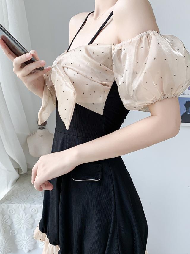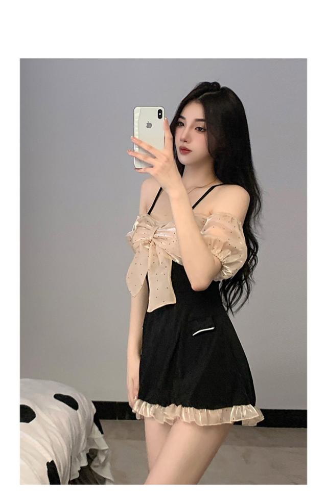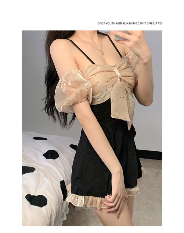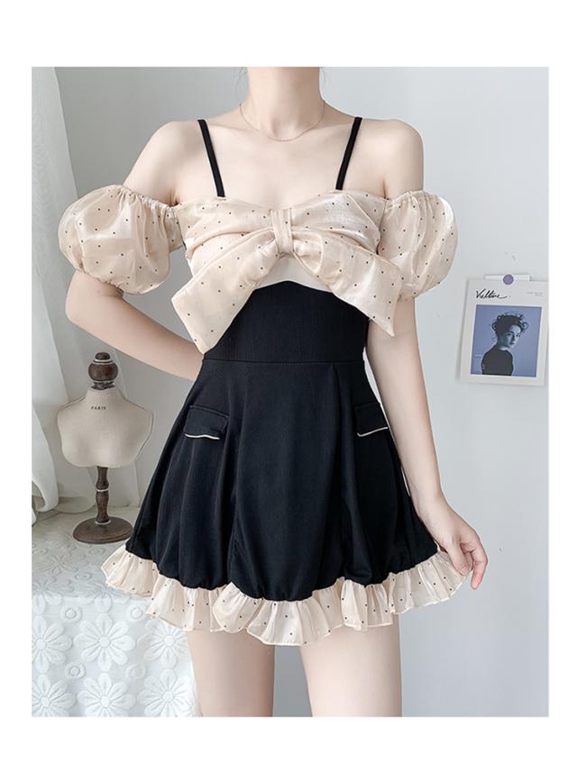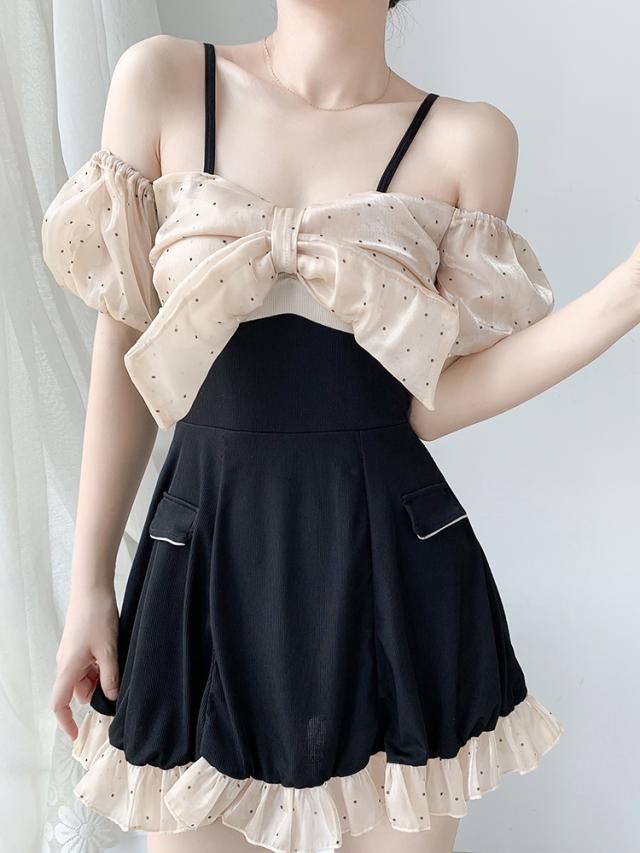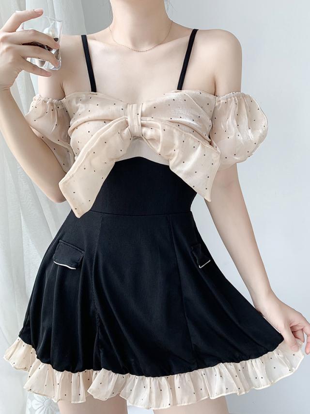 水着 スイムウエア レディース ワンピース水着 体型カバー水着 リボン オフショルダー オフショル 二の腕カバー フリル 水玉 ドット柄 シフォン ドッキング 胸元 谷間 谷間魅せ 盛れる かわいい 大人可愛い きれいめ セクシー sexy エレガント 清楚 大人 大人っぽい おしゃれ