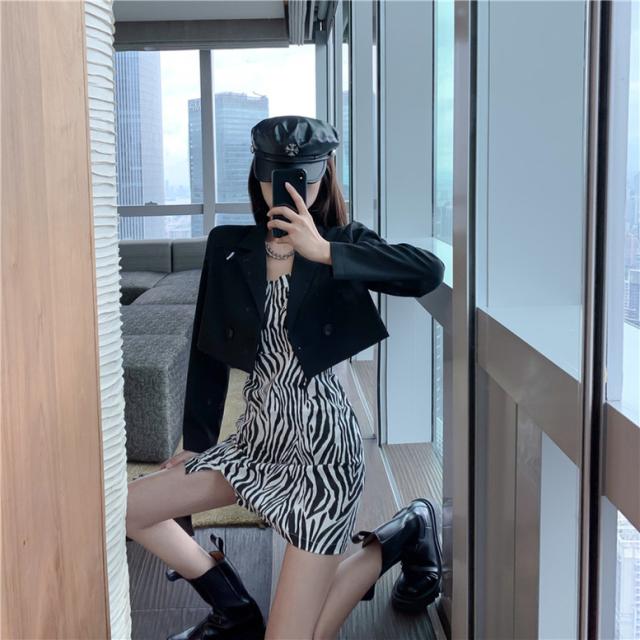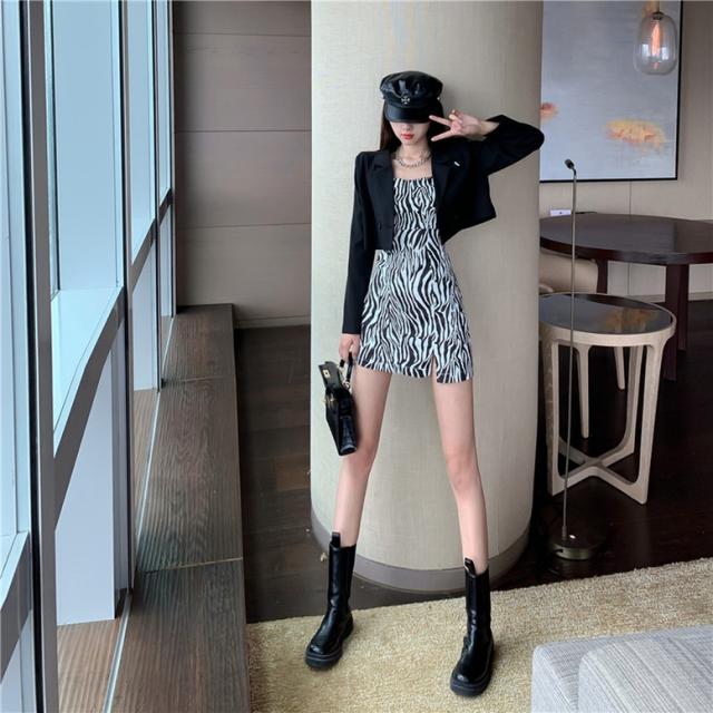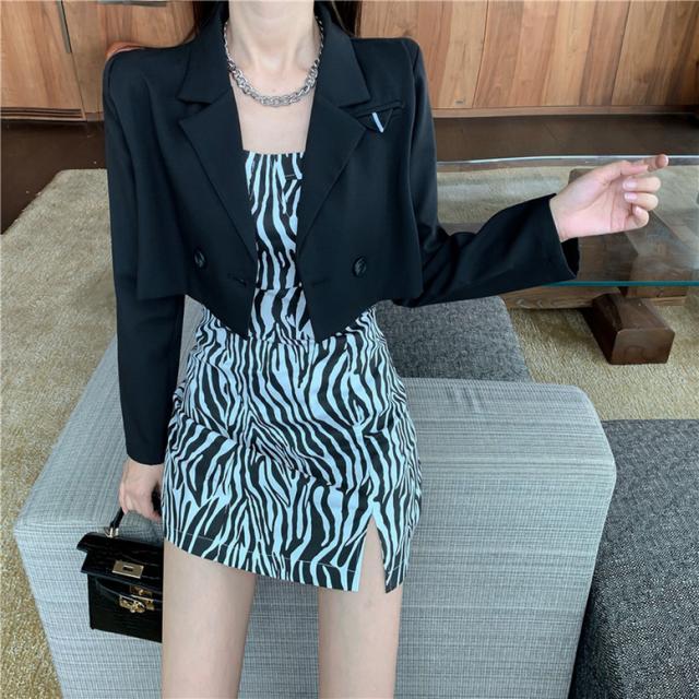 セットアップ ジャケット+ワンピースセットアップ レディース ミニワンピセットアップ 2点セット ツーピース ジャケットセットアップ クロップド丈テーラードジャケット アニマル柄キャミソールミニワンピース フィット タイト スリム 黒 ブラック 大人可愛い きれいめ 上品
