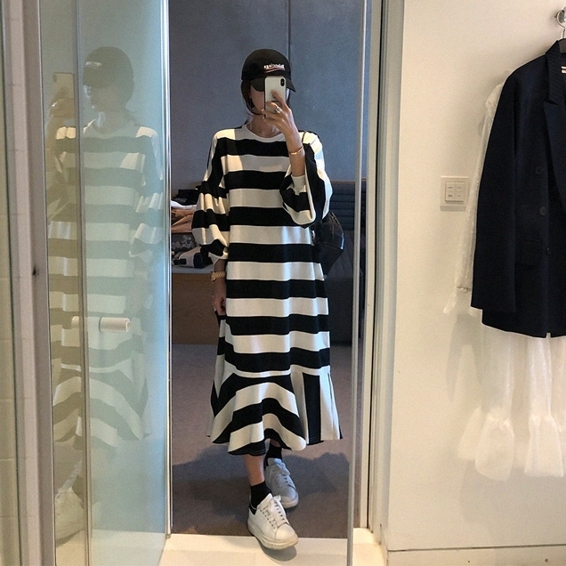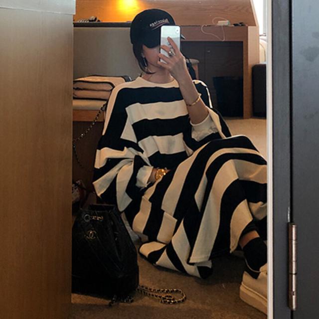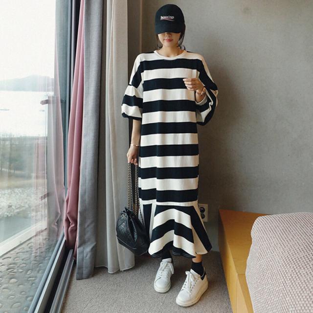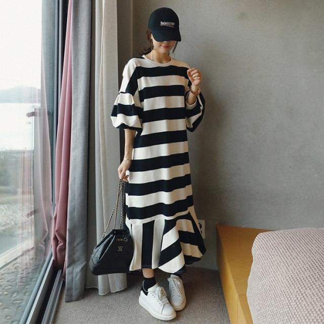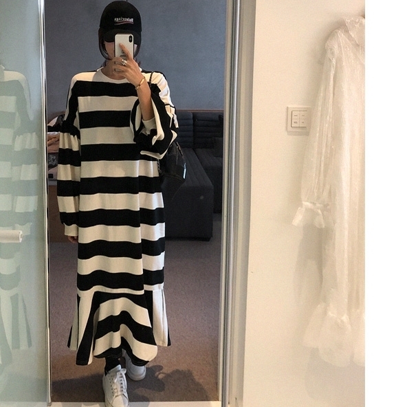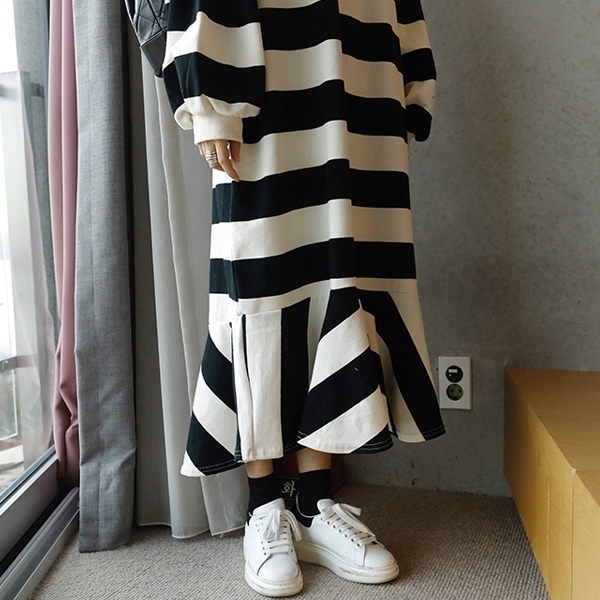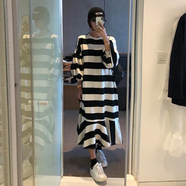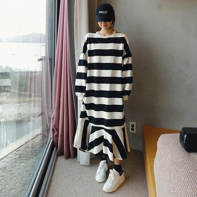 ワンピース レディース フィッシュテール フレア プルオーバー ドロップショルダー クルーネック スウェット ボーダー トレーナー ロング オーバーサイズ ゆったり 長袖 かわいい 大人可愛い カジュアル おしゃれ お洒落 こなれ感 ラフ 個性的 抜け感 存在感 S M L XL 白 ホワイト 黒 ブラック モノトーン ボーダー 春 秋 10代 20代 30代 40代 50代 ママ 学生 通学 お出かけ 休日 イベント 旅行 プレゼント ギフト 普段使い 韓国 オルチャン