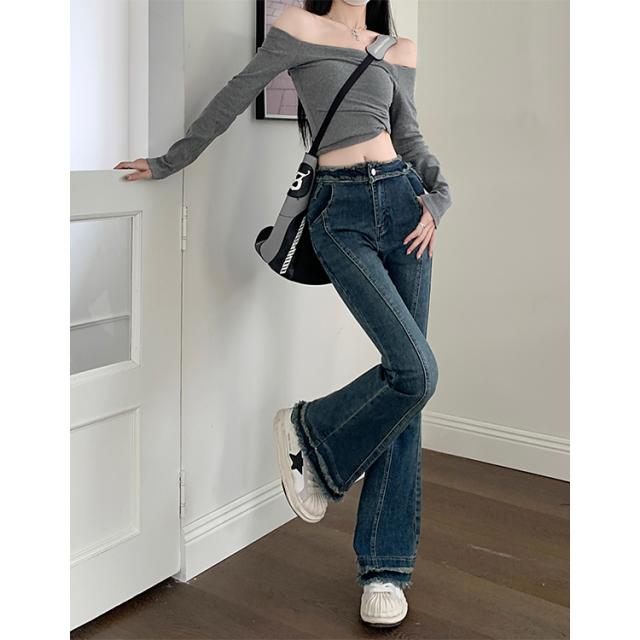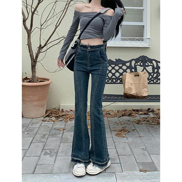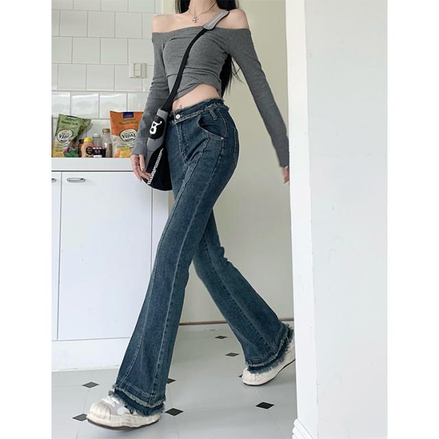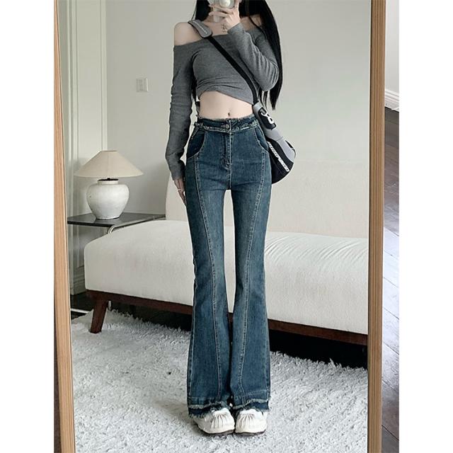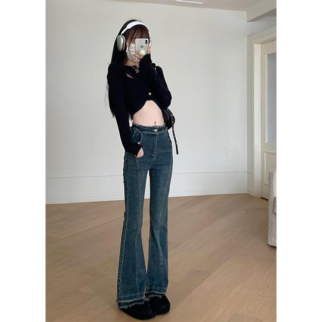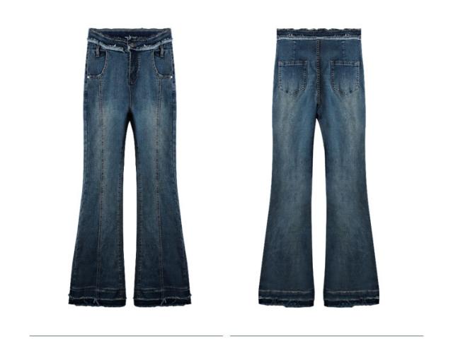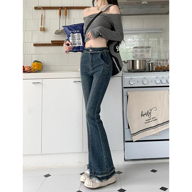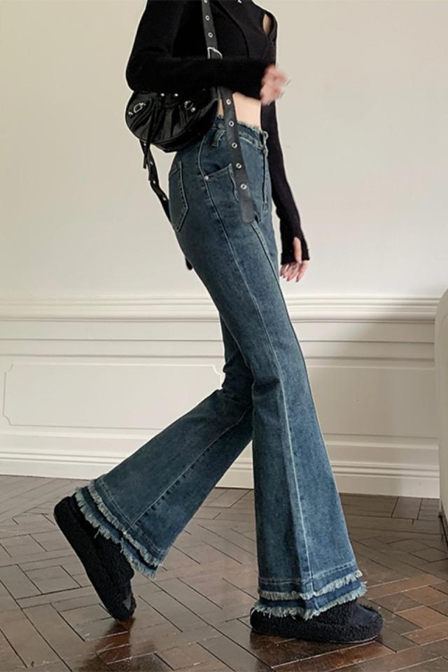 ボトムス レディース デニムパンツ ジーンズ ジーパン Gパン ラッパズボン ベルボトム フレアパンツ マーメイドパンツ ハイウエスト 脚長 美脚 センターライン 裾フレア ダメージ加工 カジュアル シンプル おしゃれ お洒落 レトロ かっこいい こなれ感 ラフ メンズライク