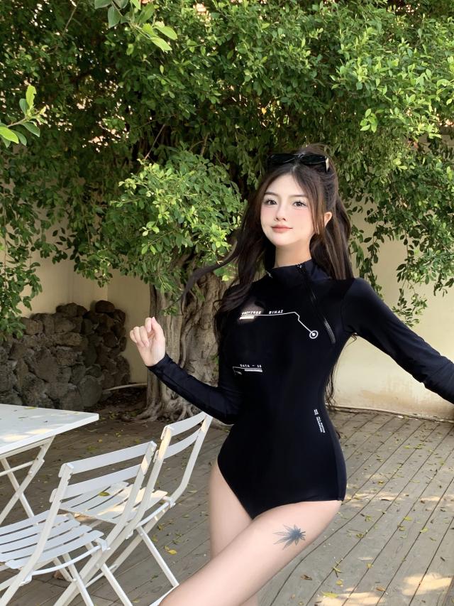 ブラックカラーの長袖ワンピース水着。