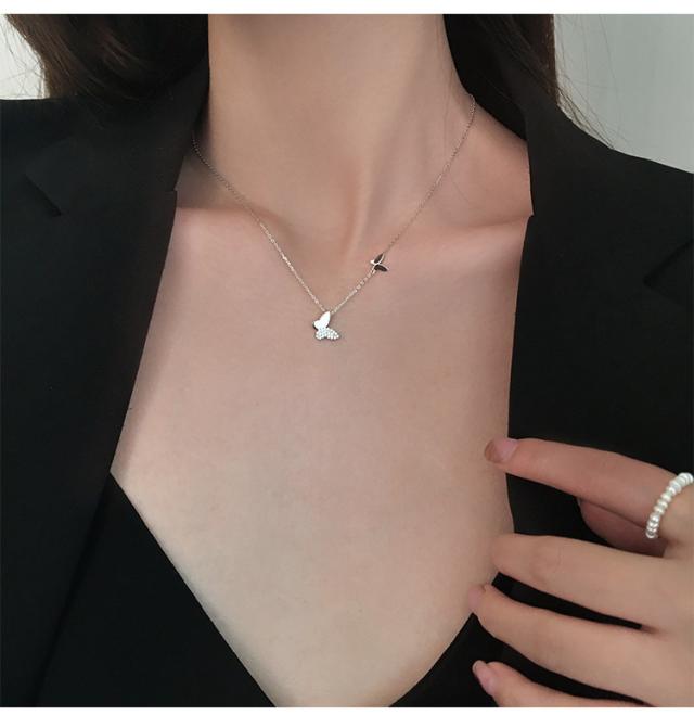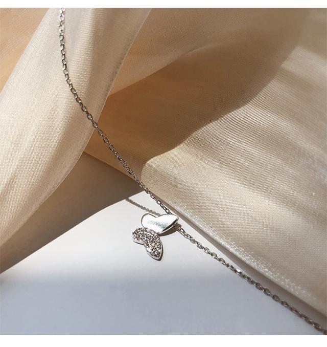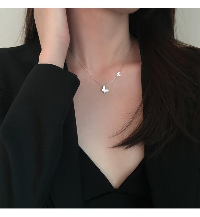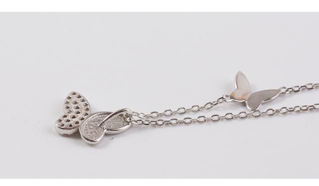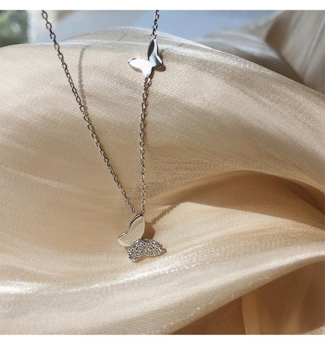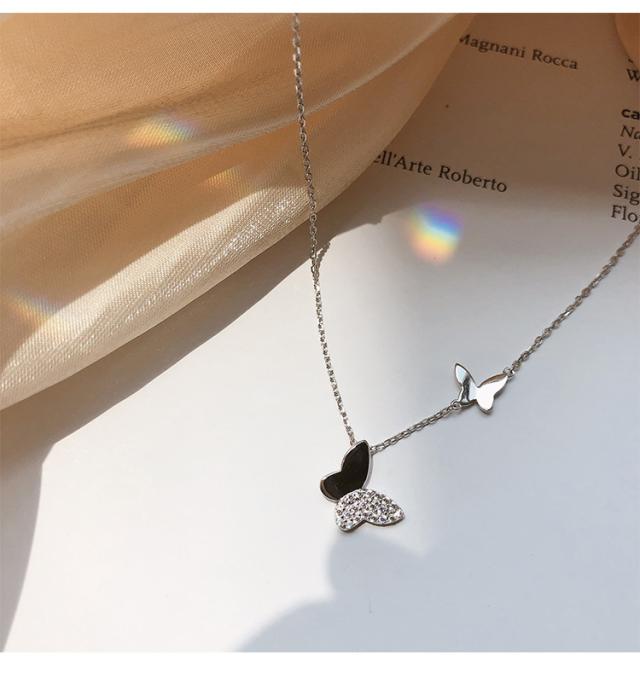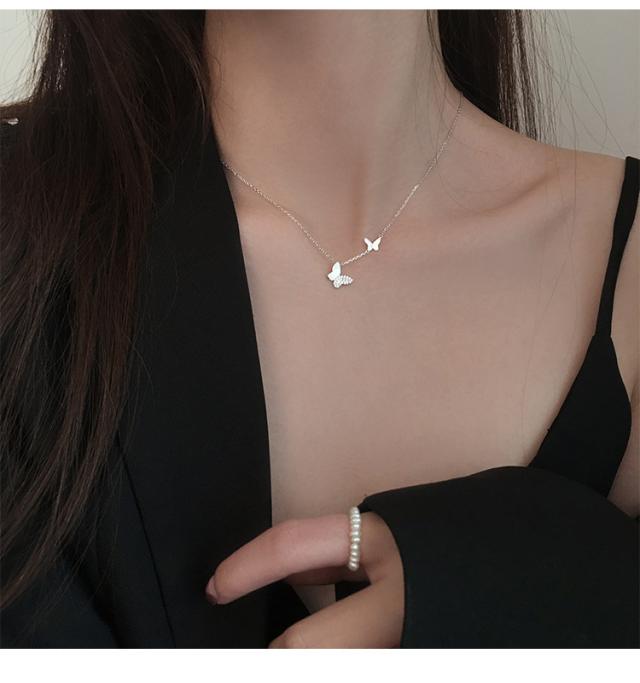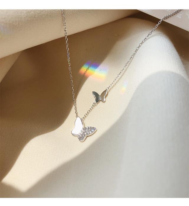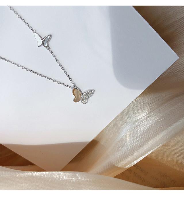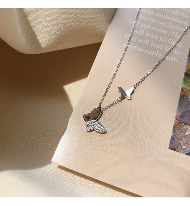 アクセサリー ネックレス レディース ペンダント シルバー 銀色 バタフライチャーム ダブル 蝶々 ちょうちょ ビジュー キラキラ チェーン 鎖骨 43cm ジルコン かわいい 大人可愛い きれいめ シンプル 大人 上品 おしゃれ お洒落 大人女子 クール エレガント フェミニン