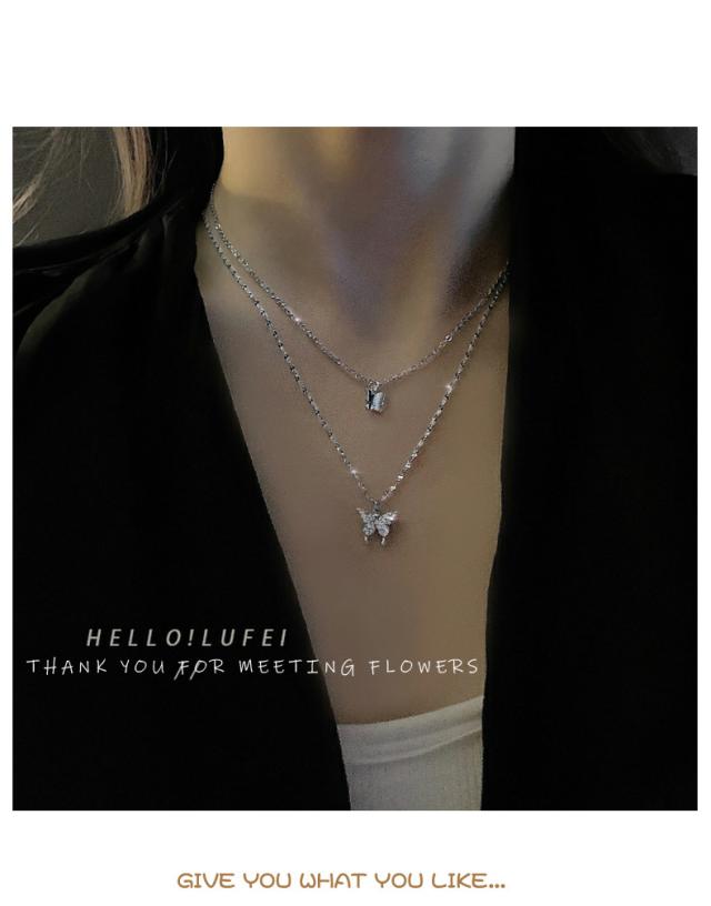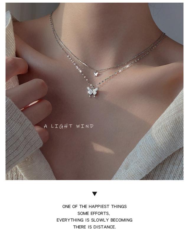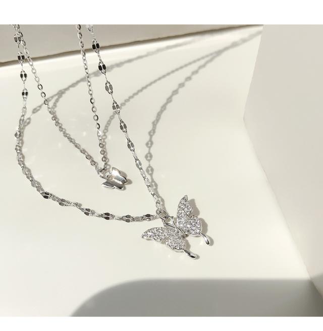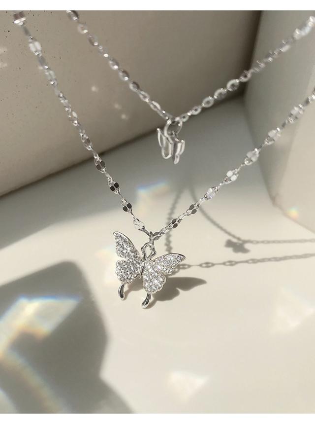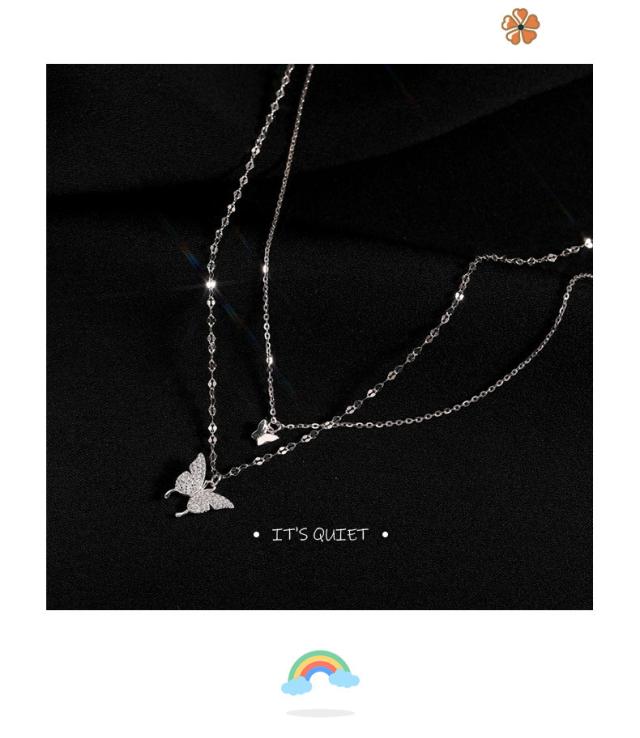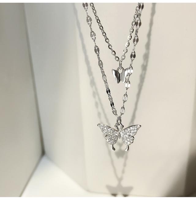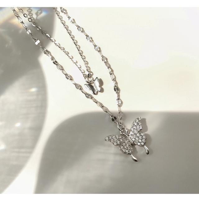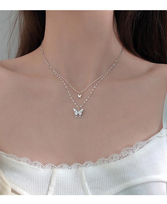 ネックレス レディース ペンダント シルバー 銀色 バタフライチャーム 2連 ビジュー 蝶々 ちょうちょ キラキラ チェーン 鎖骨 ジルコン レイヤード かわいい 大人可愛い きれいめ 大人 上品 おしゃれ お洒落 クール フェミニン キュート ガーリー ラブリー ギャル 存在感 学生