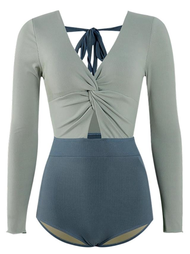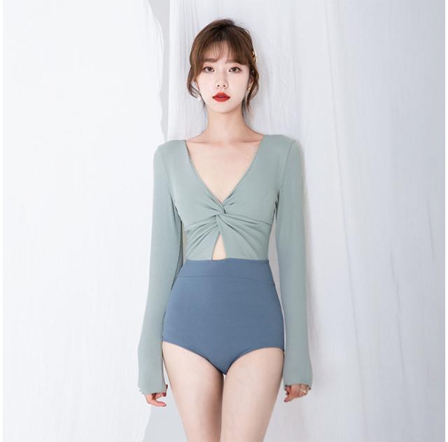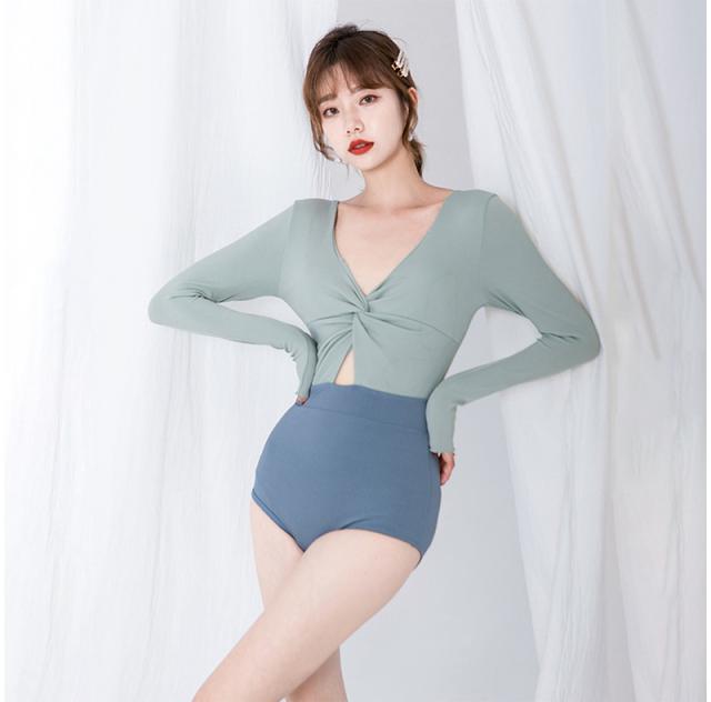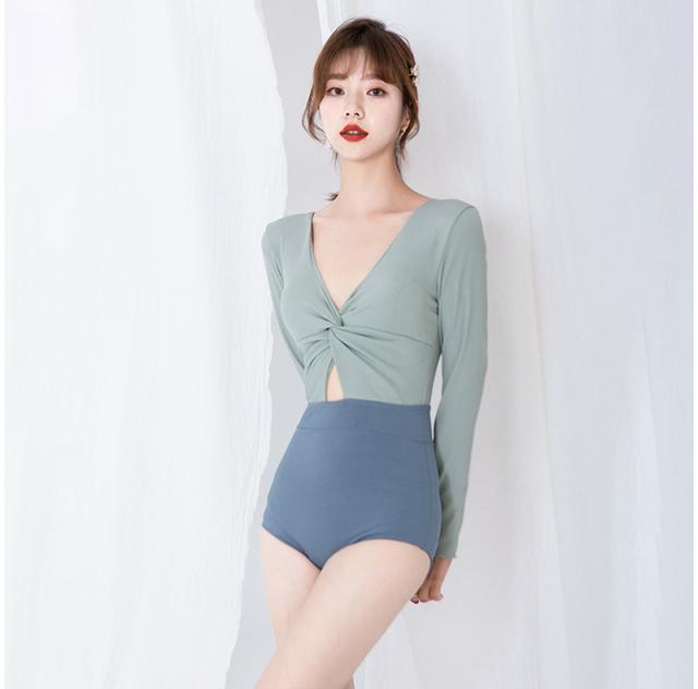 グリーン系バイカラー長袖ワンピース水着。