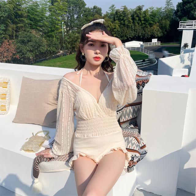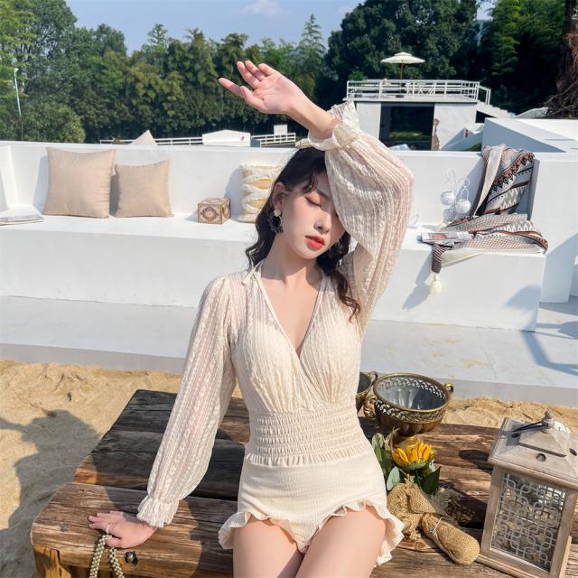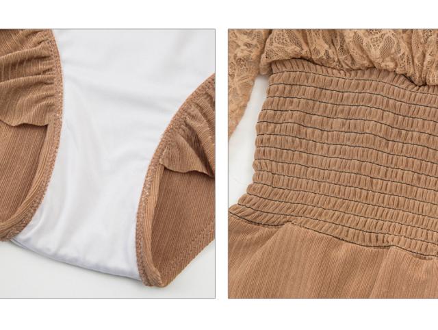 ベージュカラー長袖レースワンピース水着。