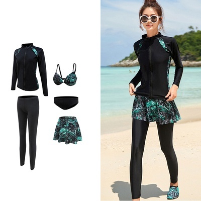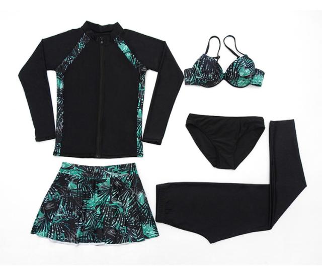 水着 ラッシュガード ビキニ 5点セット 長袖 袖あり レディース スポーティー スカート カジュアル 10代 20代 30代 40代 50代 トレンド 流行 韓国 セクシー お洒落 オシャレ かわいい 大人可愛い 大人女子 色っぽ 学生 スクール ОL 個性派 個性的 大人 色気 プール 海 海水浴 ナイトプール 映え SNS インスタ映え М L XL 2XL 大きいサイズ バイカラー 黒 ブラック 緑 グリーン 体型カバー 着痩せ 日焼け UV レギンス トップス ジップアップ ジャケット スカート