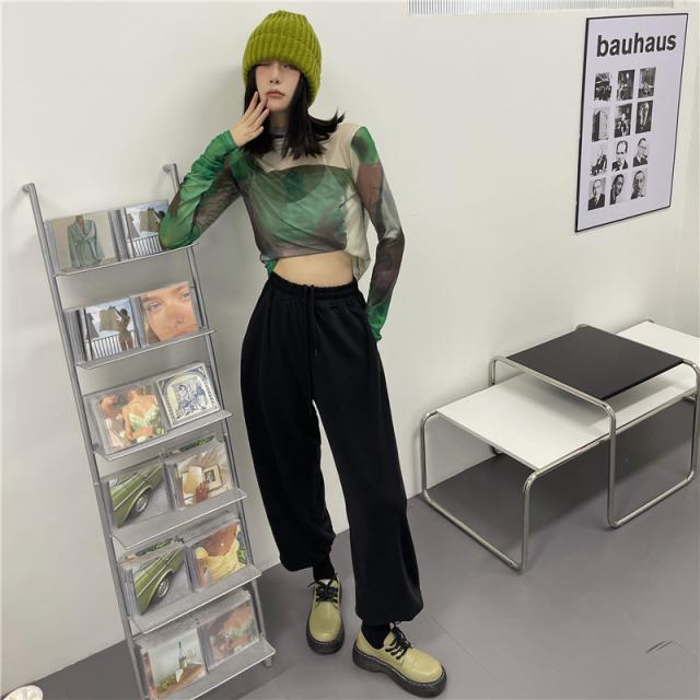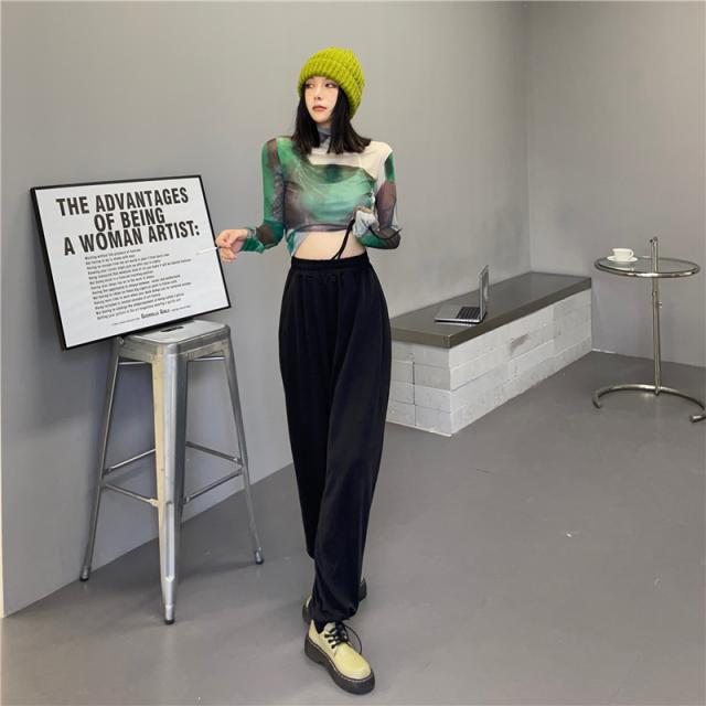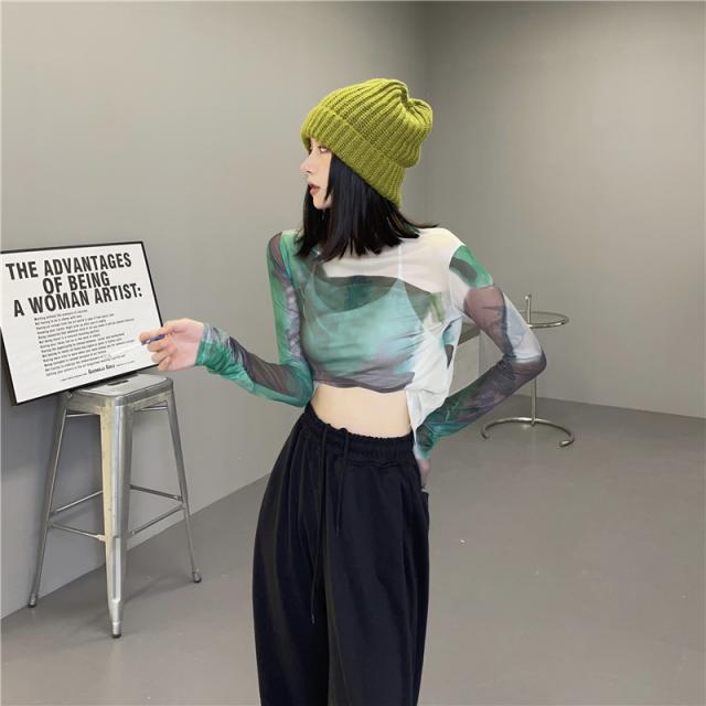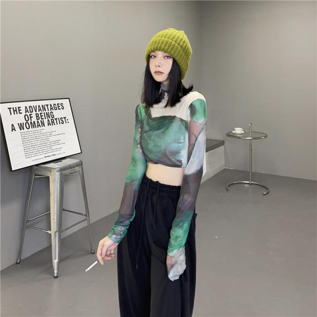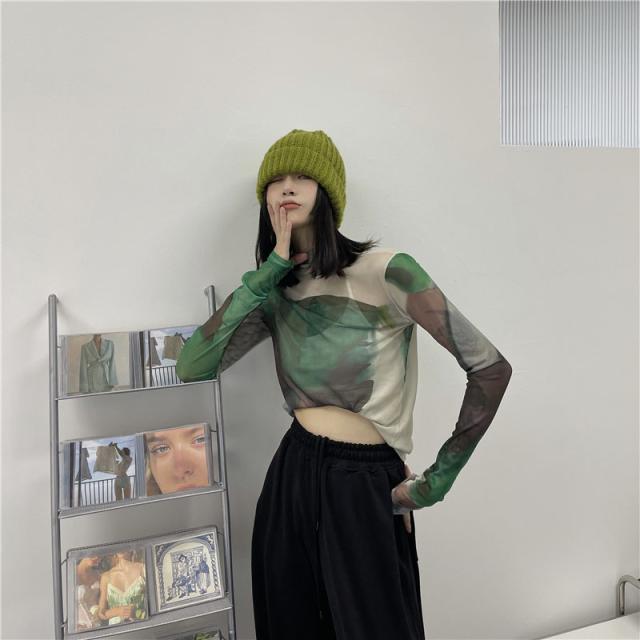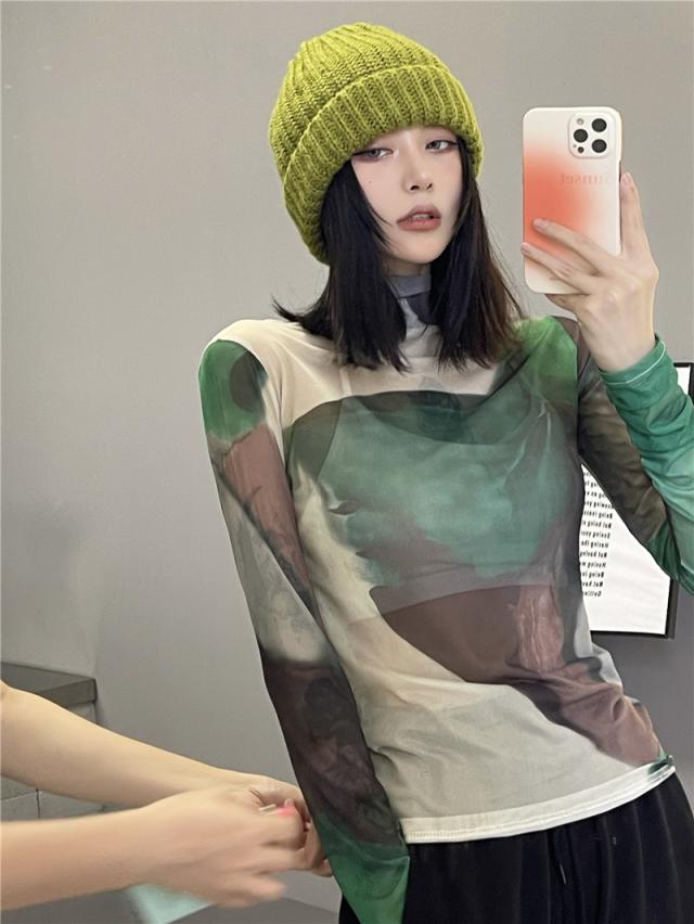 トップス シャツ カットソー ハイネック 長袖 レディース 薄手 透け感 シアー タイト ゆったり 大きめ シンプル カジュアル ラフ 総柄 緑 グリーン ホワイト 白 迷彩 くすみカラー 10代 20代 30代 40代 春 秋 夏 お洒落 オシャレ かわいい 大人可愛い こなれ感 伸縮性 着心地