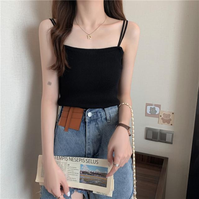 リブニットキャミソール トップス インナー レディース キャミソール タンクトップ リブキャミソール リブタンクトップ 袖なし ノースリーブ ストラップ リブニット カットソー ダブル紐 スクエアネック ライトブルー 水色 ホワイト 白 ブルーグレー 灰色 ブラック 黒