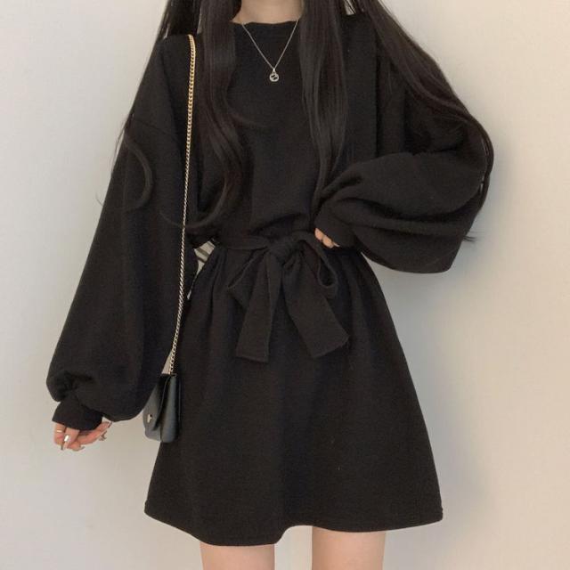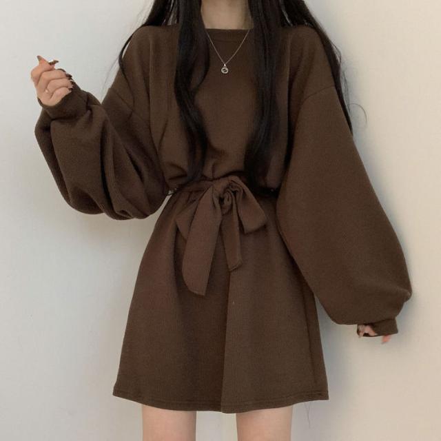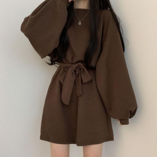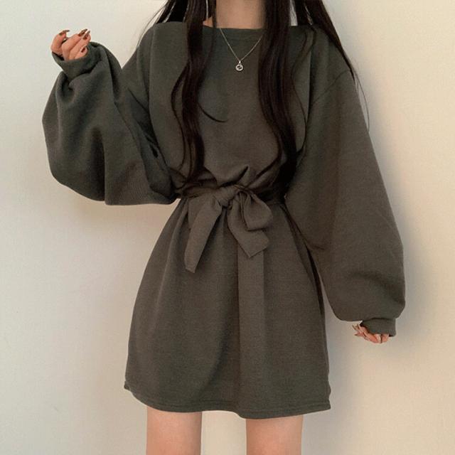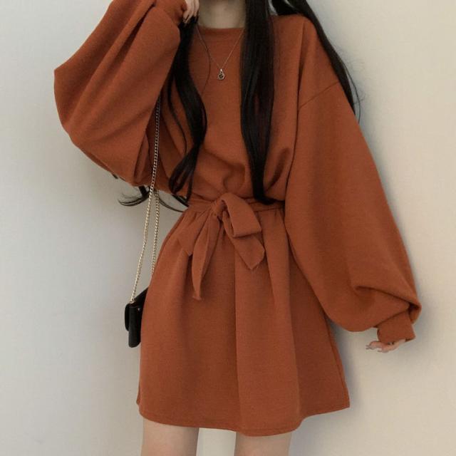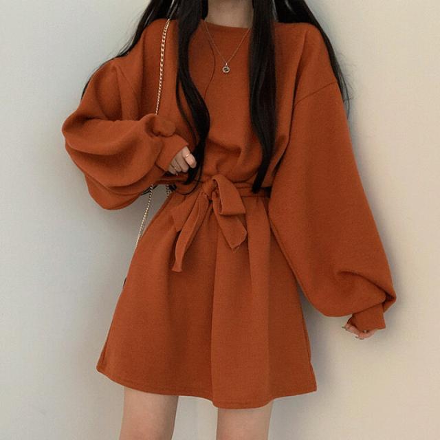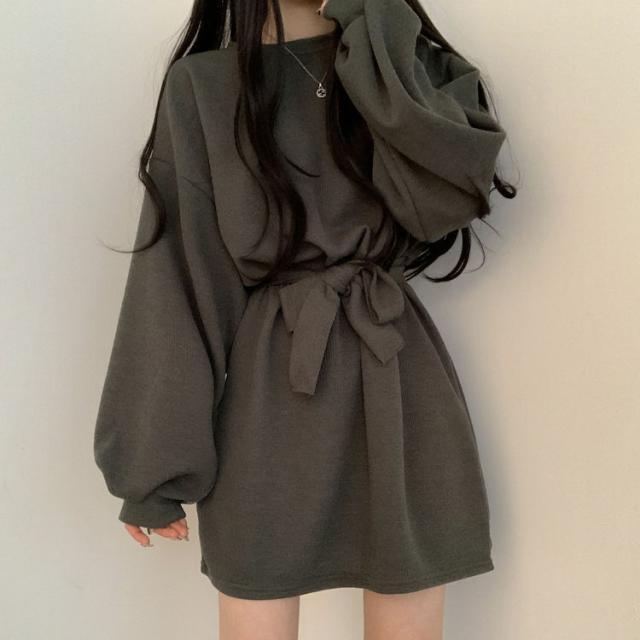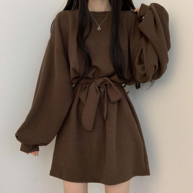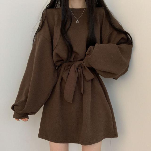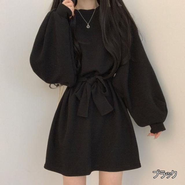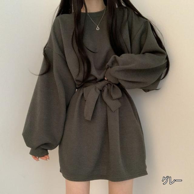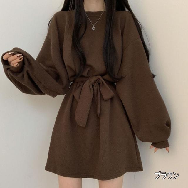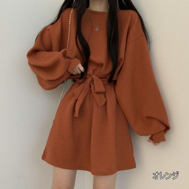 ワンピース 4色 リボン ウエスト レディース 長袖 オシャレ お洒落 かわいい 大人可愛い 10代 20代 30代 40代 ミニ丈 ショート丈 シンプル カジュアル ラフ 無地 ブラウン 茶色 黒 ブラック 灰色 グレー オレンジ くすみカラー 華奢 細見え ゆったり 大きめ 春 秋 冬 抜け感