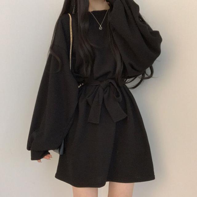 ワンピース 4色 リボン ウエスト レディース 長袖 オシャレ お洒落 かわいい 大人可愛い 10代 20代 30代 40代 ミニ丈 ショート丈 シンプル カジュアル ラフ 無地 ブラウン 茶色 黒 ブラック 灰色 グレー オレンジ くすみカラー 華奢 細見え ゆったり 大きめ 春 秋 冬 抜け感 こなれ感 ショッピング レトロ ヴィンテージ ドロップショルダー ゆる ルーズ 体型カバー こなれ感 ボリューム 袖 Aライン 体型カバー М L XL 2XL 3XL 大きいサイズ プラスサイズ