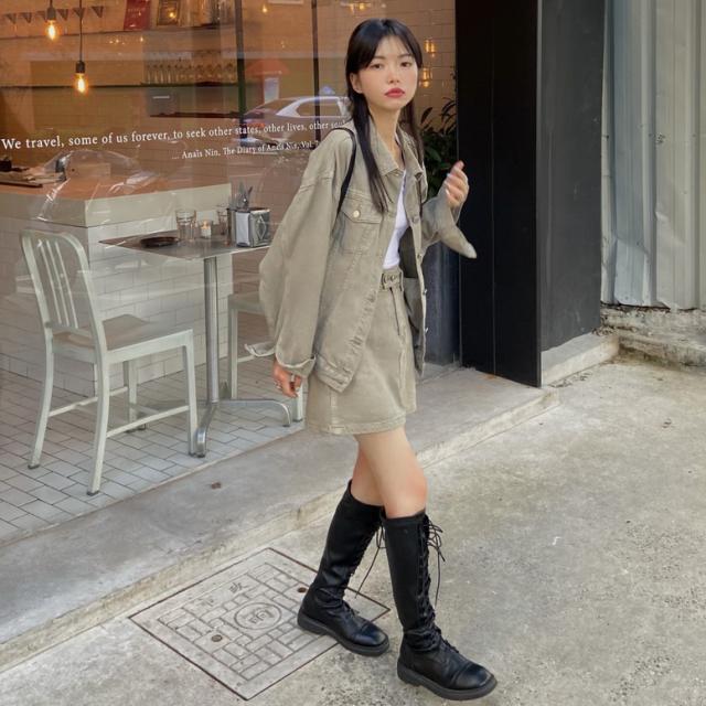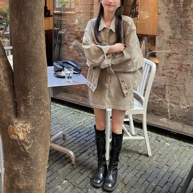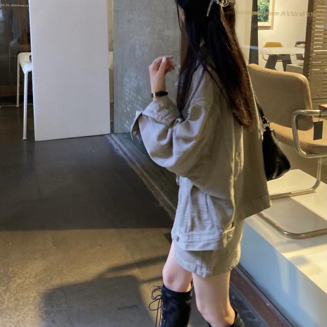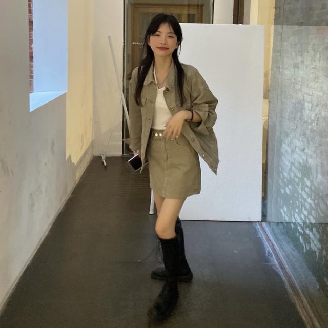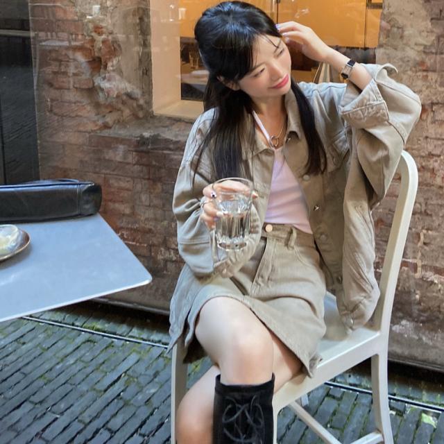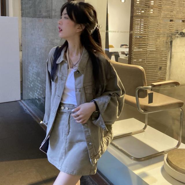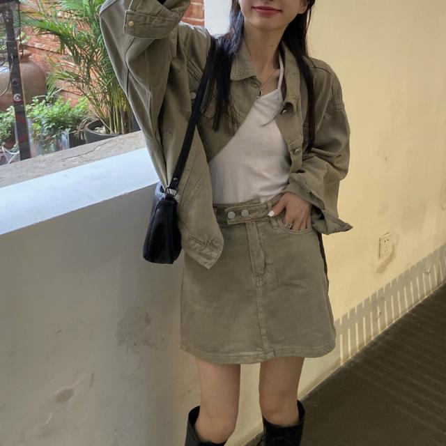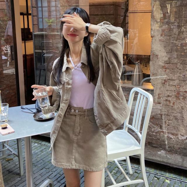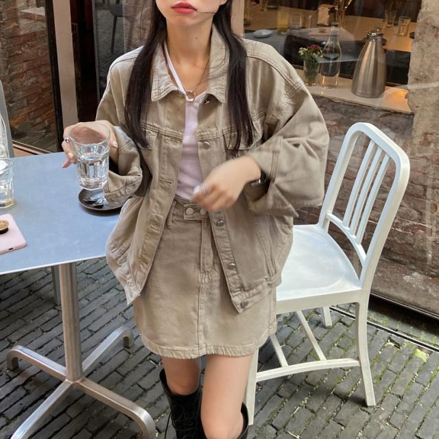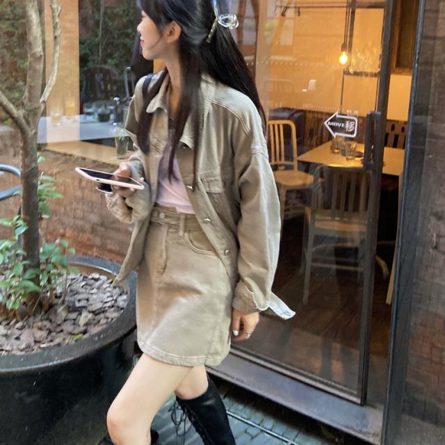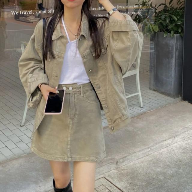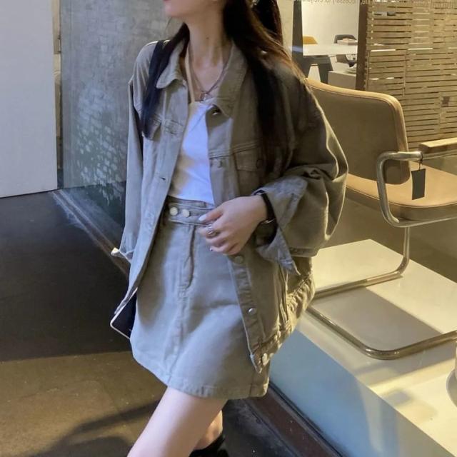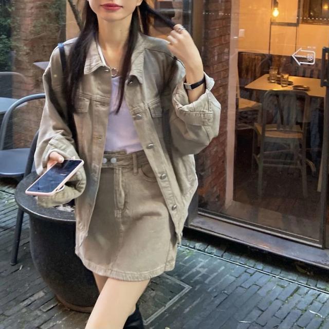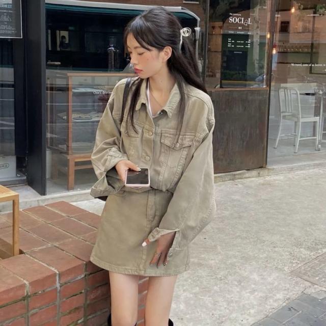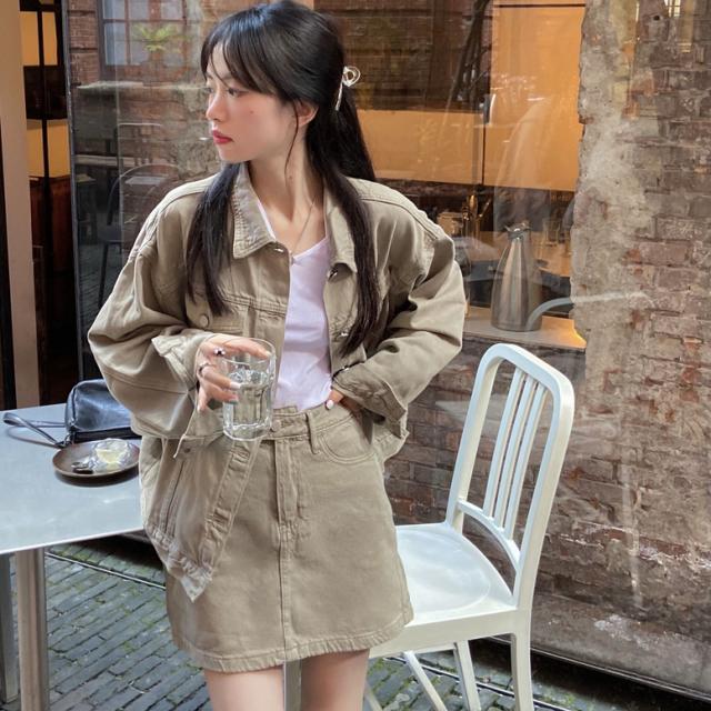 セットアップ ジャケット&ミニスカートセットアップ レディース 2点セット 上下セット ツーピース デニムスーツ カラーデニム シャツジャケット 襟付き 長袖 ドロップショルダー スカート ショート丈 タイト カーキ 大人可愛い きれいめ 上品 エレガント ガーリー マニッシュ ルーズ キュート レトロ クール 大人女子 春 夏 秋 冬 二次会 オフィス OL 通勤 学生 通学 デート お出かけ イベント 休日 旅行 アウトドア 体型カバー 美脚 脚長 トレンド ゆったり インスタ映え アースカラー
