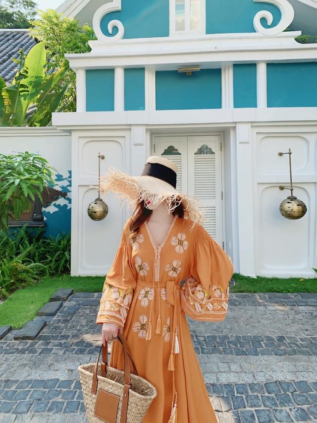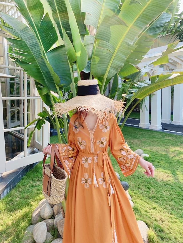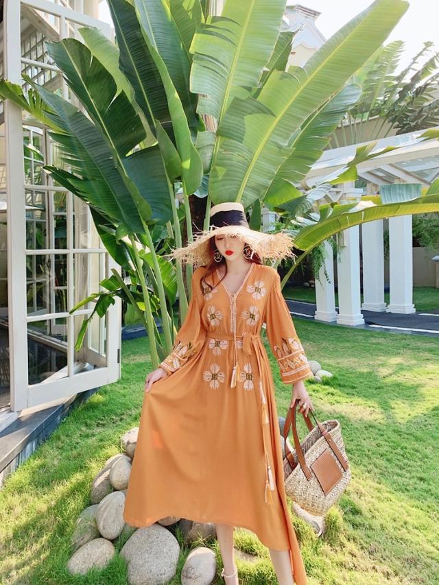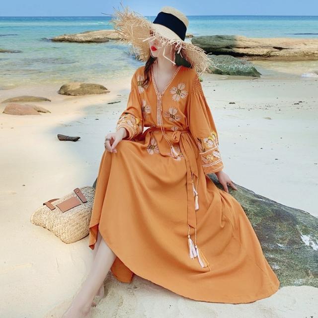 ワンピース ロング丈 長袖 刺繍 フリンジ レディース エスニック レトロ アジアン エキゾチック リゾート ボヘミアン ゆったり 大きめ ワイド S М L Aライン 花柄 フラワー マキシワンピース ロングワンピ ラオレンジ 派手 華やか オシャレ お洒落 かわいい 大人可愛い
