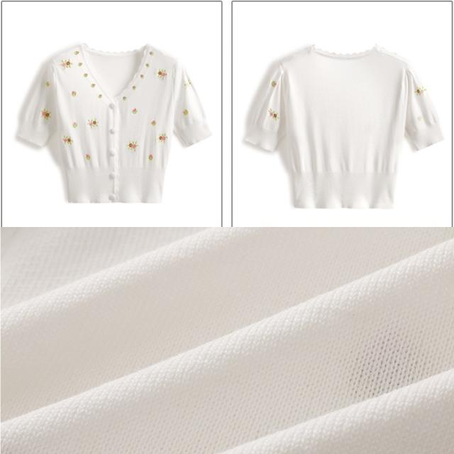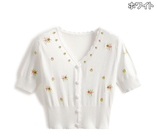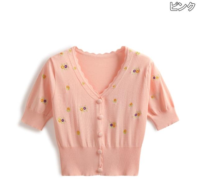 カーディガン レディース トップス ニット ニットトップス ワンサイズ フリーサイズ イエロー 黄色 ホワイト 白 ピンク 刺繍 花 フラワー フローラル パステルカラー シャーベットカラー Vネック フロントボタン 前開き フリル 春 夏 半袖 ショート丈 クロップド丈 ママ フェミニン ナチュラル カジュアル きれいめ きれカジ キュート ガーリー モテ 大人 大人可愛い こなれ感 ぬけ感 シンプル お出かけ デート 休日 定番 万能 着回し 王道 学生 通学 韓国 オルチャン ポップ 華やか 10代