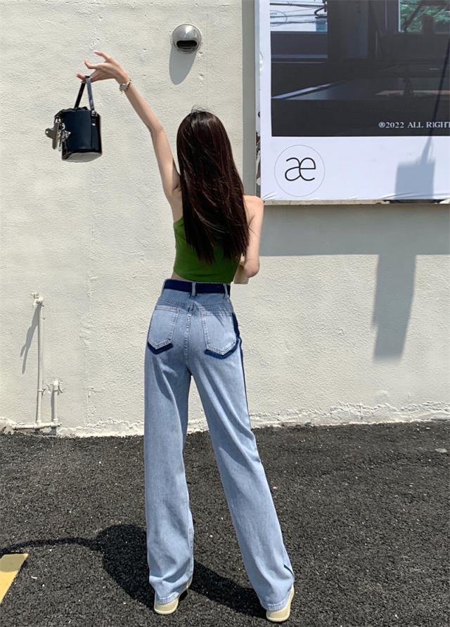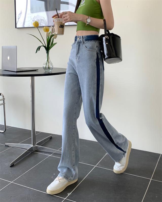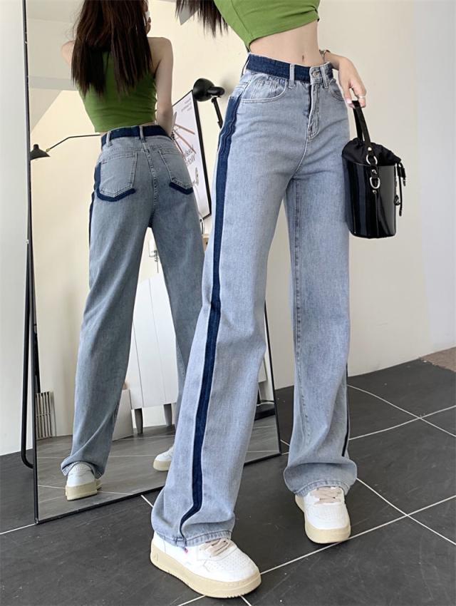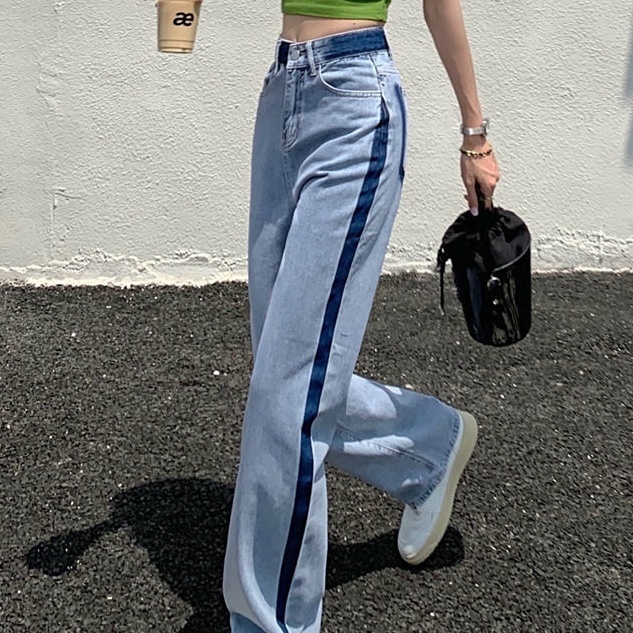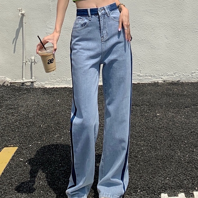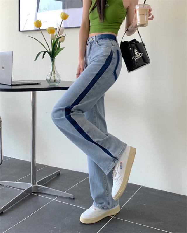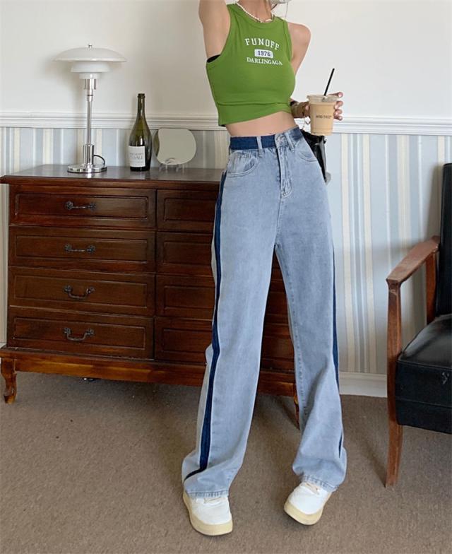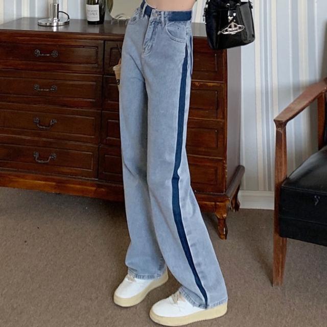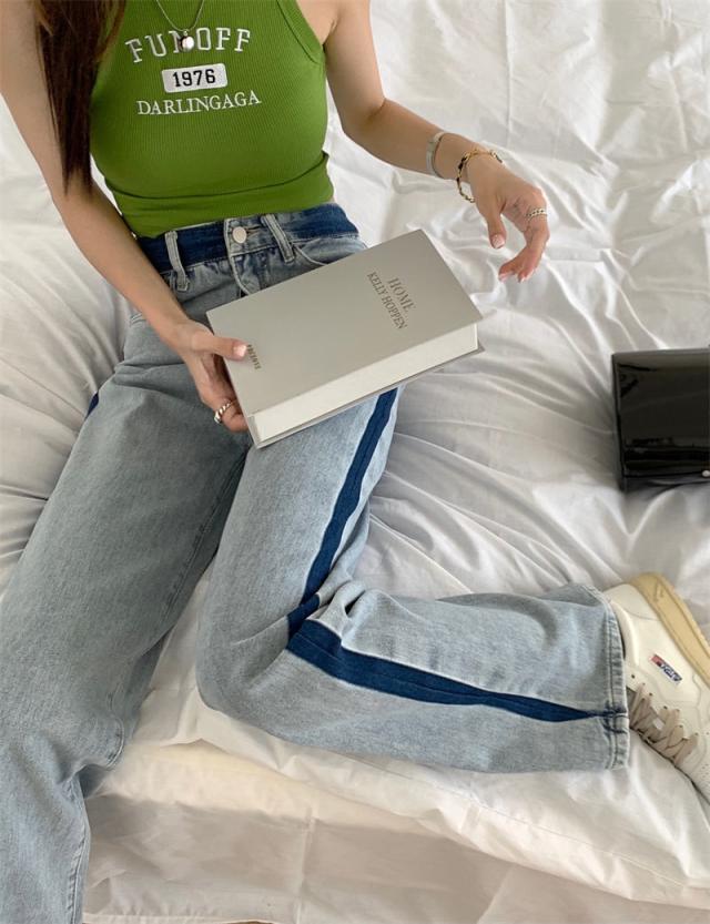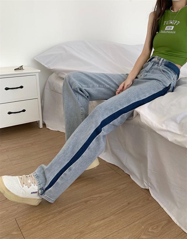 ボトムス デニム パンツ サイドライン コントラスト ジーンズ レディース ハイウエスト ゆったり タイト スリム シンプル カジュアル ラフ こなれ感 オシャレ お洒落 ストレート 美脚 脚長 着回し クール ブリーチ 加工 色落ち オールシーズン 春 夏 秋 冬 20代 30代 40代