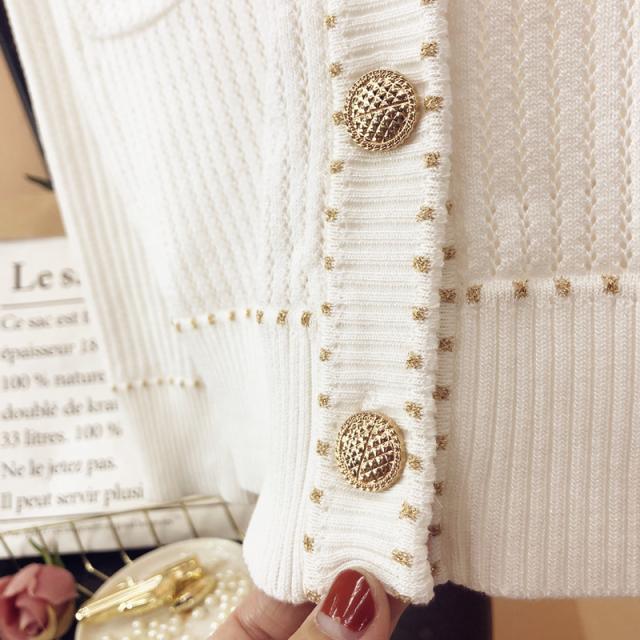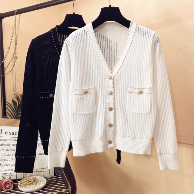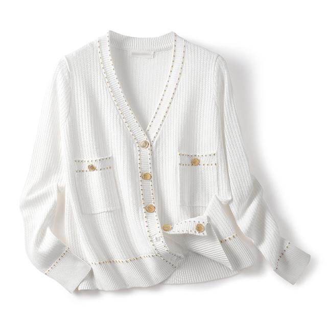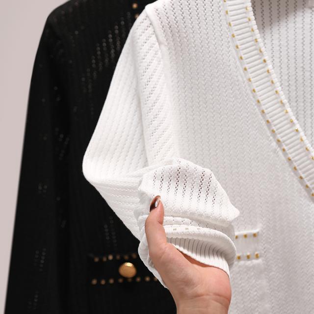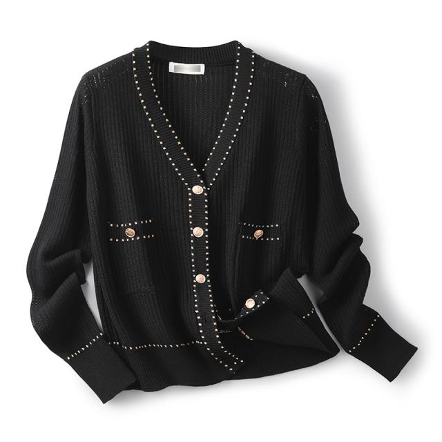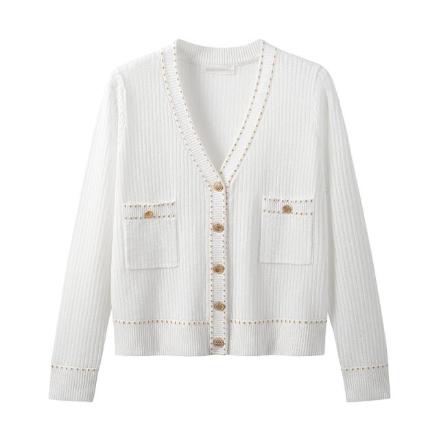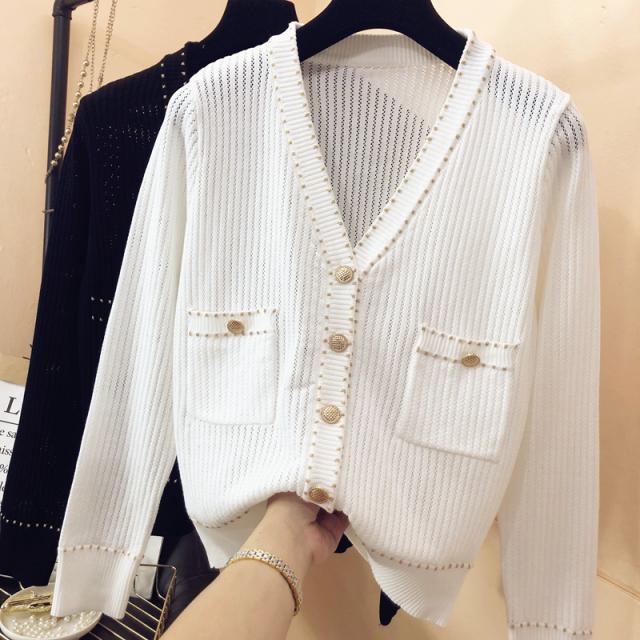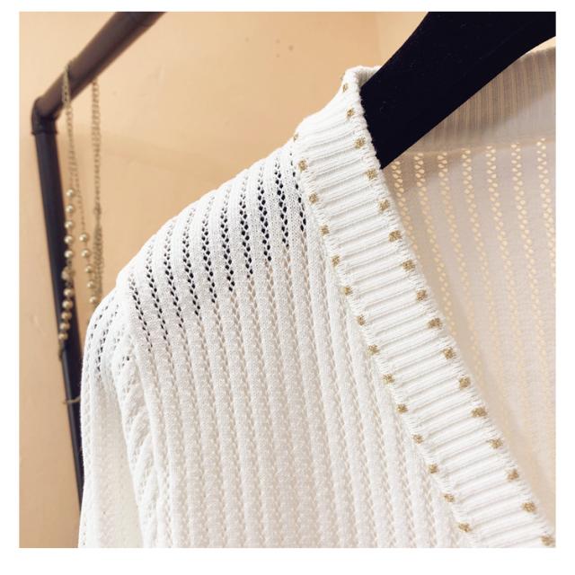 トップス レディース カーディガン 薄手 長袖 透け感 ニット サマーニット Vネック 金ボタン メタルボタン 刺繍 大人可愛い きれいめ シンプル 大人 上品 おしゃれ お洒落 大人女子 こなれ感 クール 抜け感 S M L XL 白 ホワイト 黒 ブラック 無地 春 夏 秋 10代 20代 30代