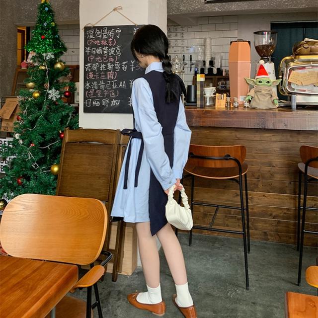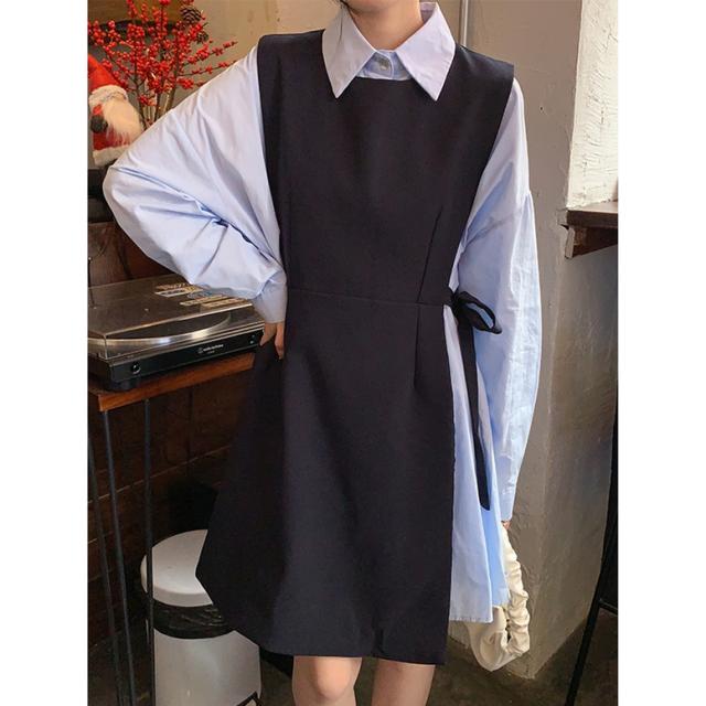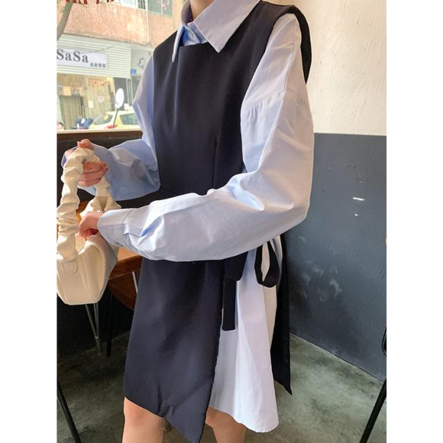 セットアップ シャツワンピースセットアップ レディース 2点セット ツーピース シャツワンピース ロングベスト 襟付き 長袖 ショート丈 ウエストリボン 重ね着 レイヤード 青 灰色 ブルー グレー 大人可愛い きれいめ 上品 エレガント フォーマル ガーリー マニッシュ