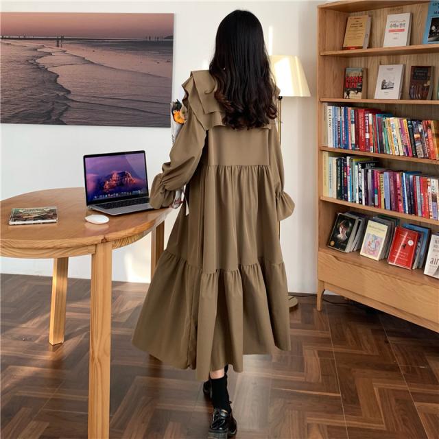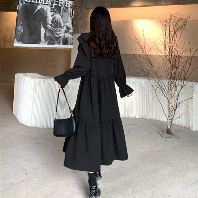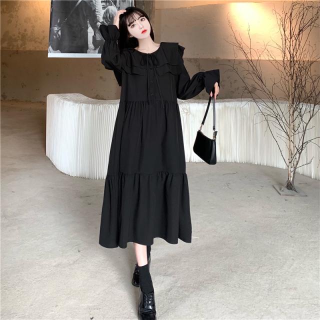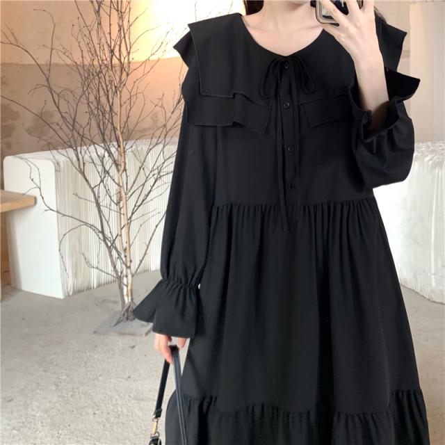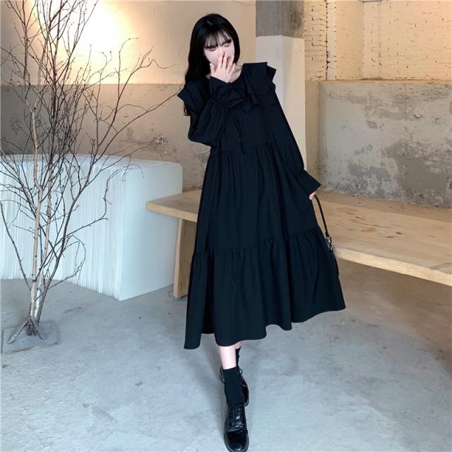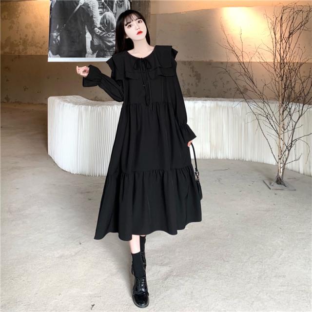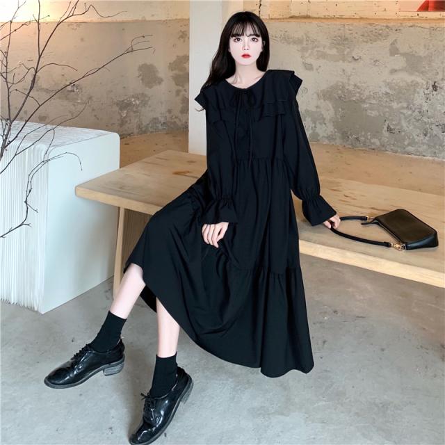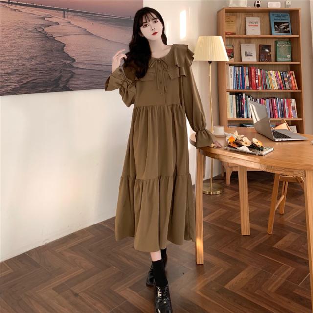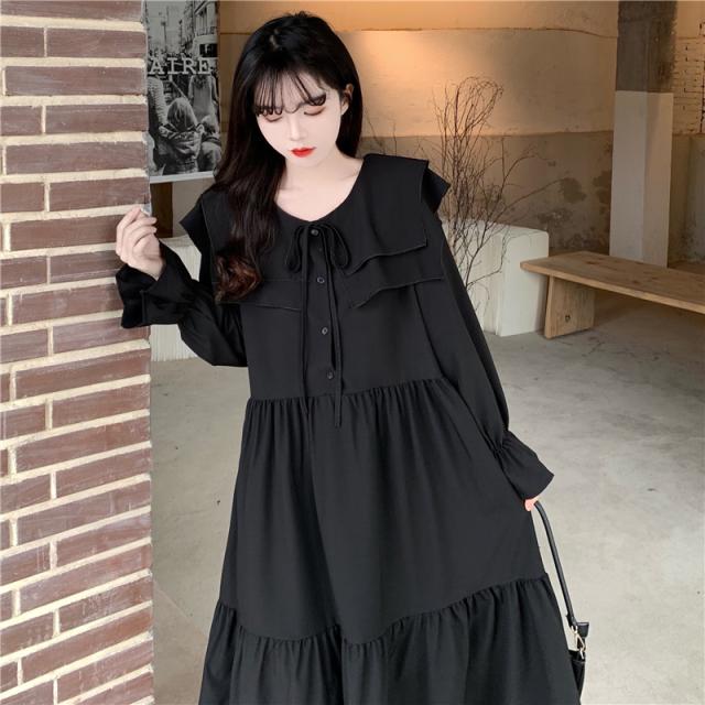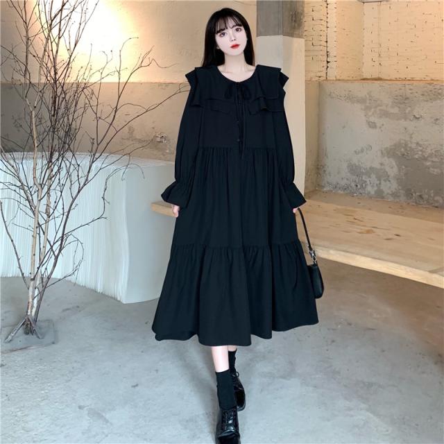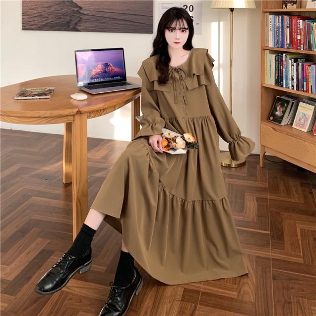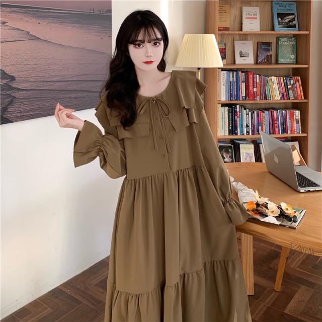 ワンピース ティアードワンピース プラスサイズ ロング丈 ミモレ丈 長袖 レディース フリル リボン ビッグカラー 春 秋 冬 Aライン セーラー襟 ラウンドネック ふんわり ガーリー フェミニン シンプル カジュアル ゆったり 体型カバー 細見え 着痩せ オシャレ お洒落 かわいい 大人可愛い 10代 20代 30代 40代 茶色 ブラウン 黒 ブラック 華奢 韓国 トレンド 流行 映え SNS 女子会 モテ デート 量産 姫系 普段着 スタイルアップ 小顔 L XL 2XL 3XL 4XL 大きめ