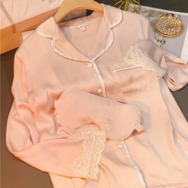 パジャマ 上下セット アイマスク付き 3点セット 長袖 レース レディース 無地 ピンク 光沢 サテン パステルカラー 前開き ボタン ポケット オープンカラー シンプル カジュアル きれいめ 上品 エレガント お洒落 オシャレ かわいい 大人可愛い 10代 20代 30代 40代 50代 春 夏
