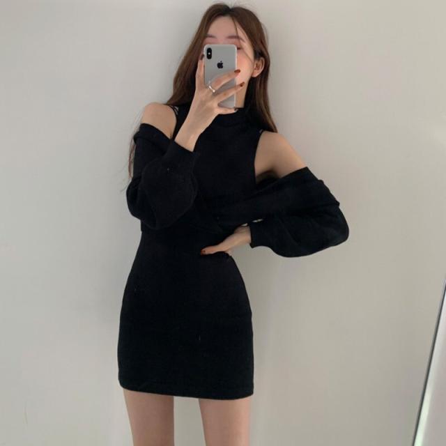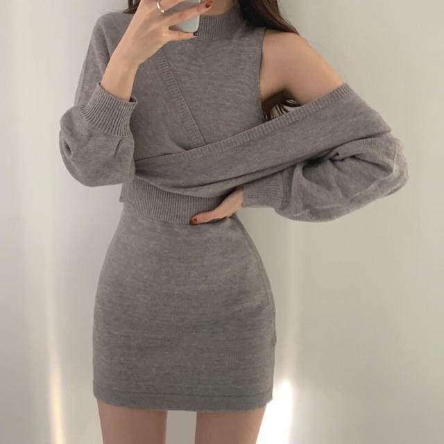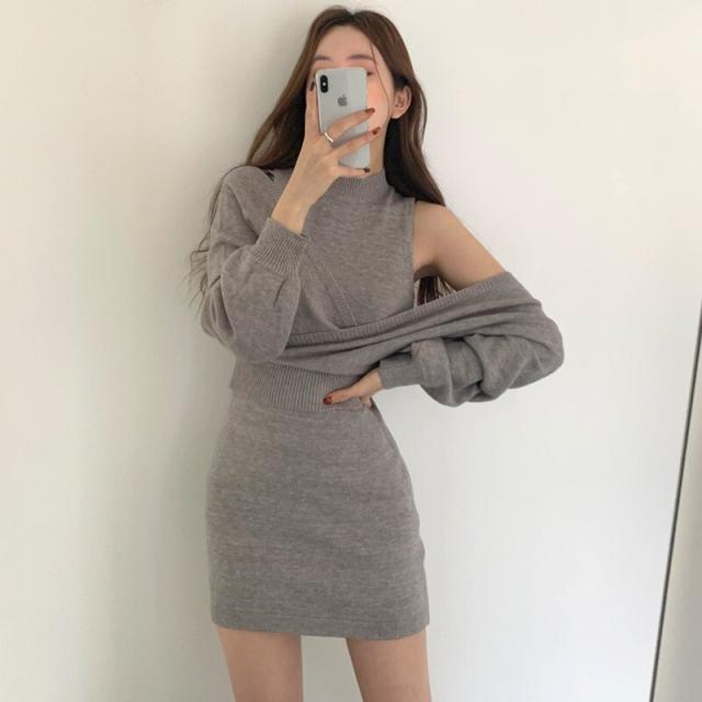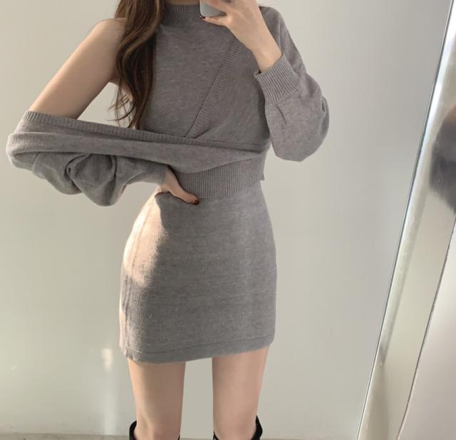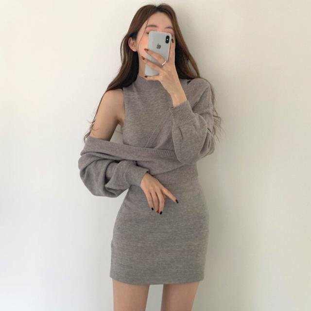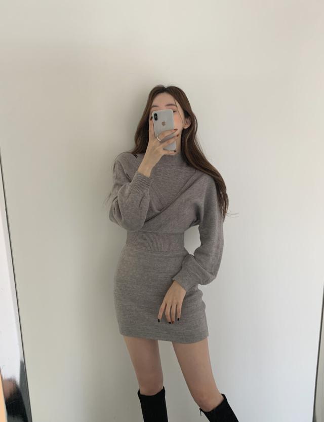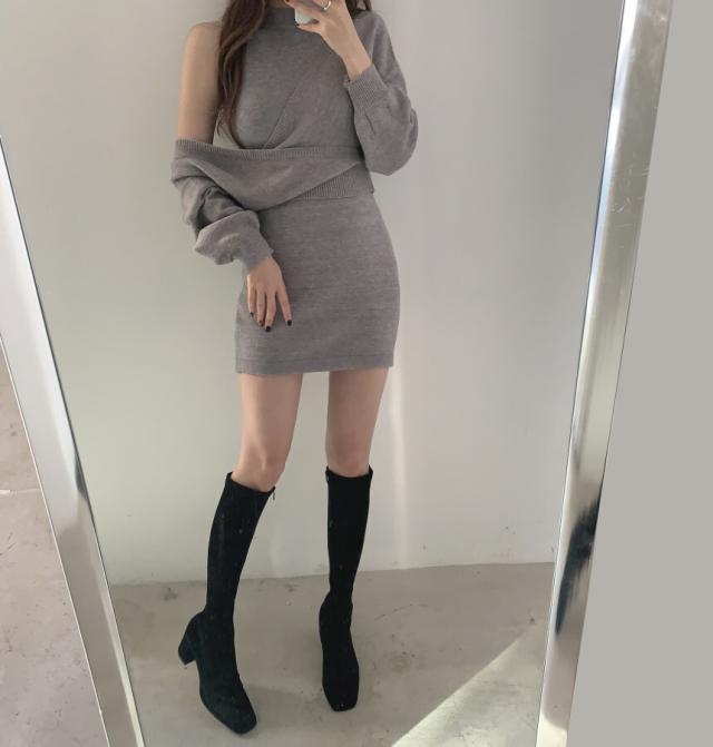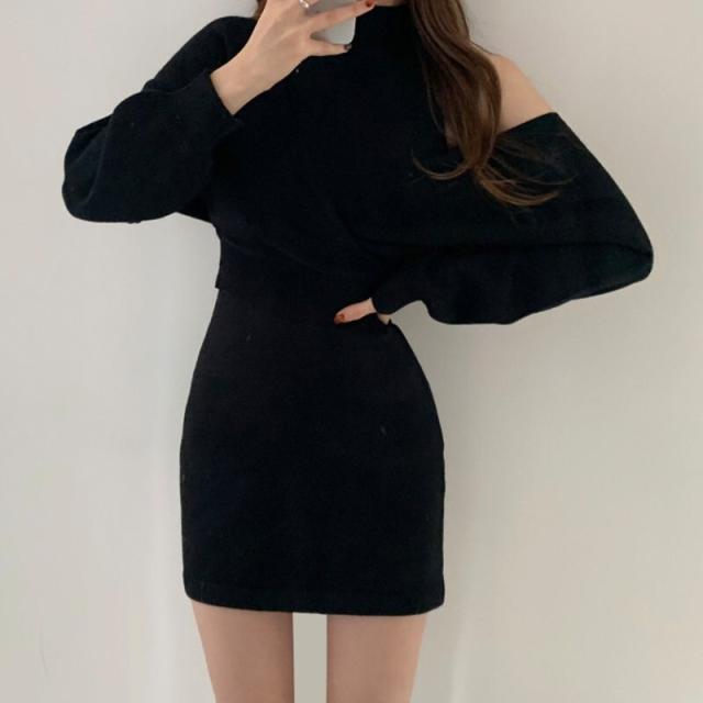 2色カラバリ、オフショルニットとミニワンピのセットアップ。