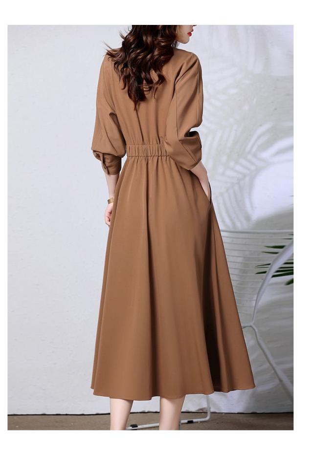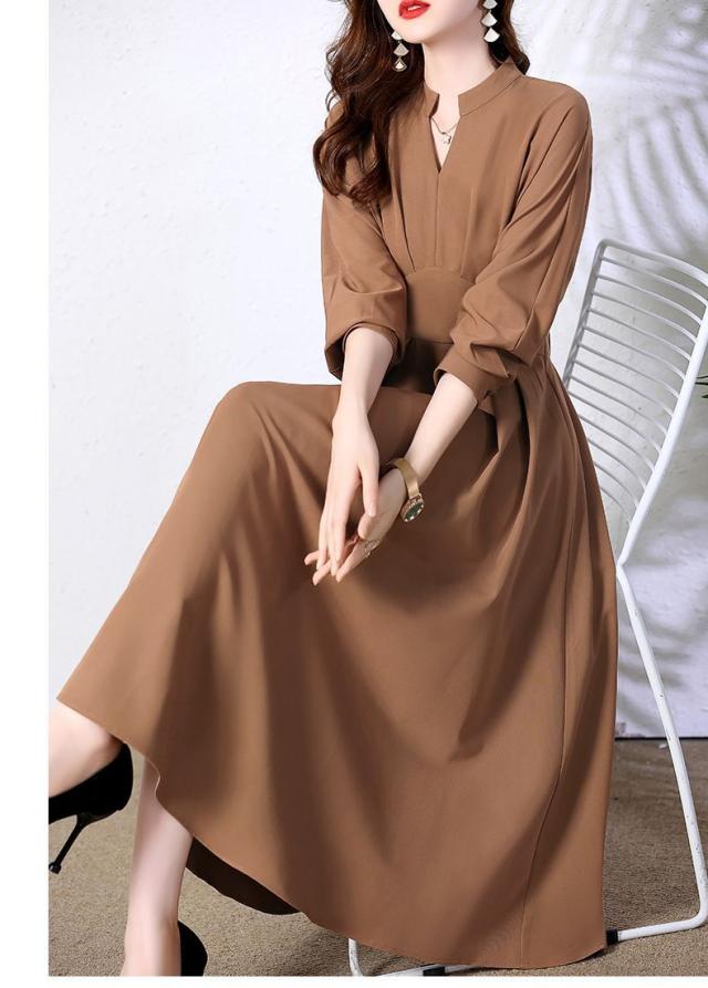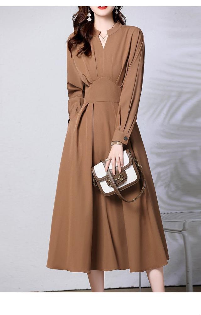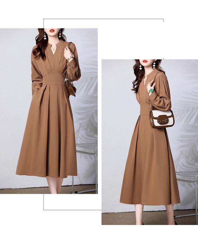 ワンピース レディース ロングワンピース ママスーツ スワンネック 長袖 Aライン フレア タック ウエストマーク 大人可愛い きれいめ 上品 おしゃれ お洒落 かっこいい レトロ 大人女子 フェミニン エレガント 清楚 存在感 抜け感 こなれ感 高見え M L XL 2XL 3XL ブラウン