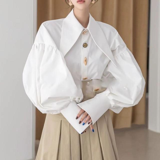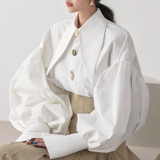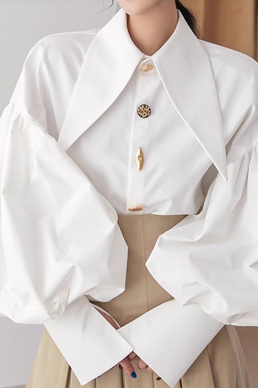 トップス レディース 長袖シャツ ブラウス 長袖 襟付き 前開き ボタン ドロップショルダー ランタンスリーブ ボリューム袖 細長襟 大人可愛い おしゃれ お洒落 きれいめ シンプル 大人 かっこいい クール 大人女子 個性的 クール モード系 主役級 存在感 抜け感 こなれ感 S M L XL ホワイト 白 黒 ブラック 無地 春 夏 秋 10代 20代 30代 40代 50代 お出かけ 女子会 旅行 イベント 休日 韓国 オルチャン 重ね着 着回し レイヤード パーティー