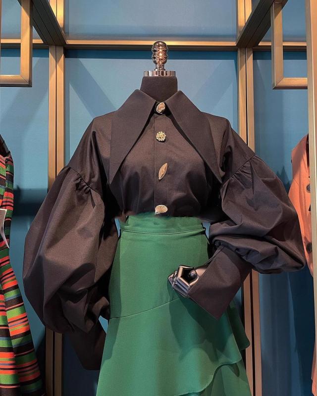 トップス レディース 長袖シャツ ブラウス 長袖 襟付き 前開き ボタン ドロップショルダー ランタンスリーブ ボリューム袖 細長襟 大人可愛い おしゃれ お洒落 きれいめ シンプル 大人 かっこいい クール 大人女子 個性的 クール モード系 主役級 存在感 抜け感 こなれ感 S M