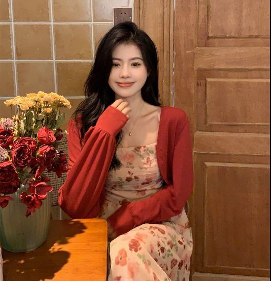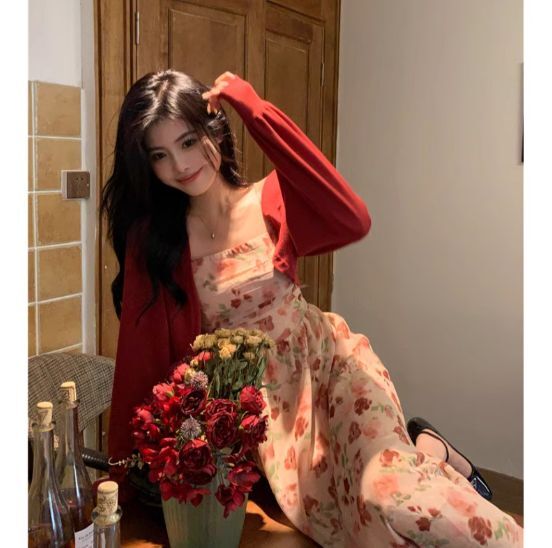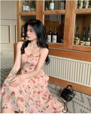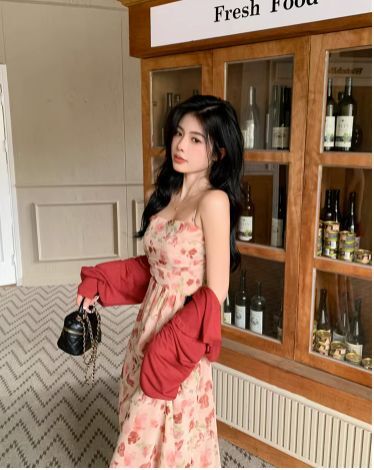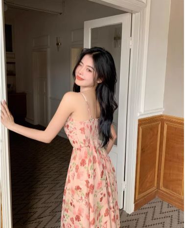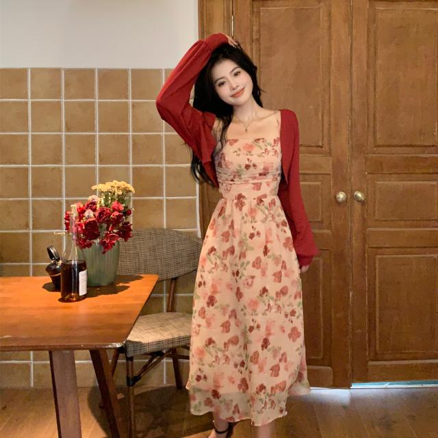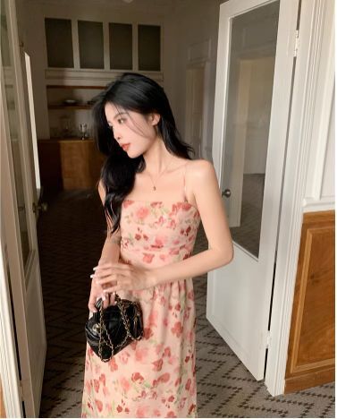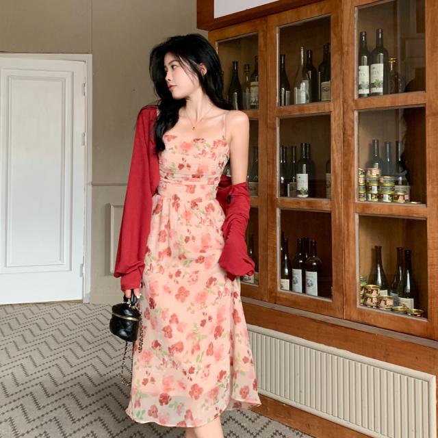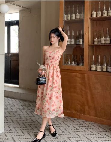 ピンクカラーの花柄ミモレ丈キャミソールワンピース。