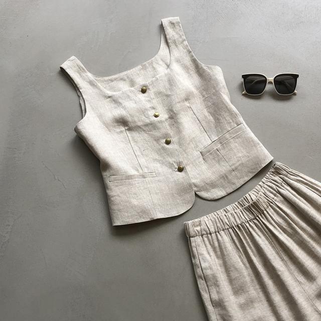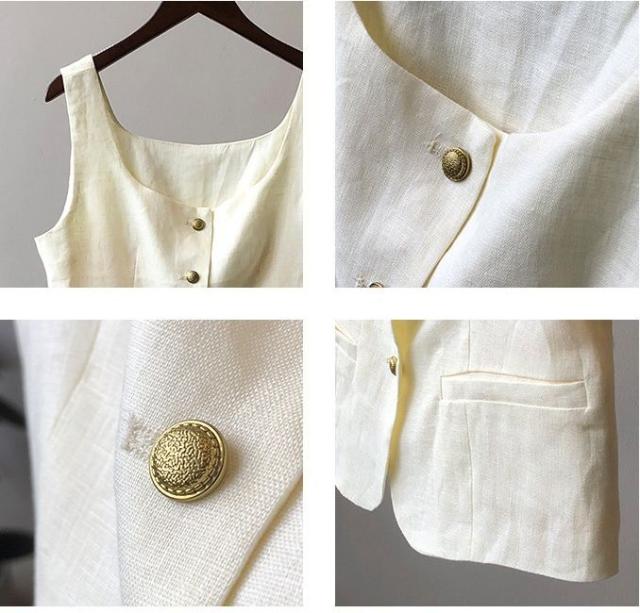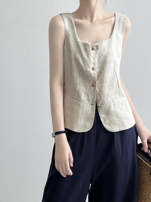 トップス レディース リネンベスト ジレ Uネック ノースリーブ 金ボタン メタルボタン 前開き ポケット 麻 大人可愛い きれいめ シンプル カジュアル ナチュラル 大人 上品 おしゃれ お洒落 かっこいい 大人女子 こなれ感 存在感 抜け感 M L ベージュ カーキ 緑 ホワイト 白 ブラック 黒 ブラウン 茶色 無地 春 夏 秋 10代 20代 30代 40代 50代 60代 ママ 学生 通学 通勤 OL オフィス お出かけ 女子会 休日 旅行 普段使い デイリー 着回し 重ね着 韓国 オルチャン