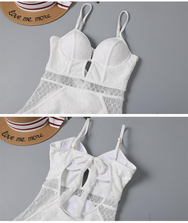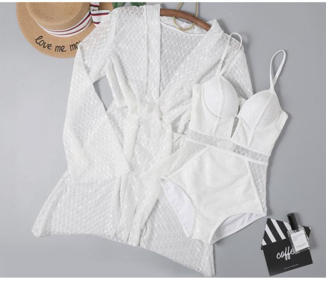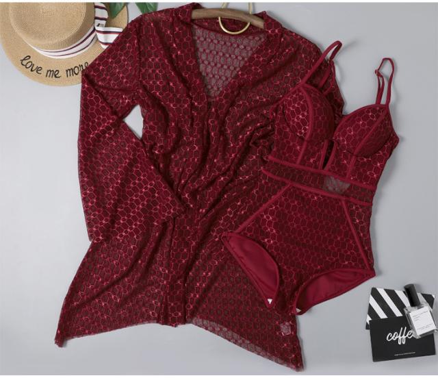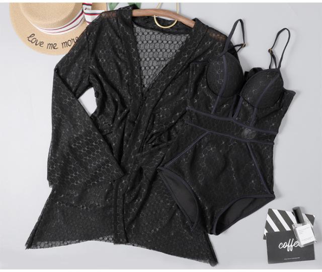3色カラバリ、レースワンピース水着とレース長袖カーディガン2点セット。