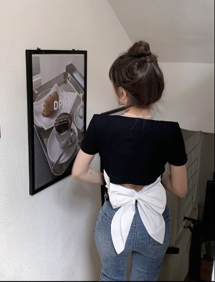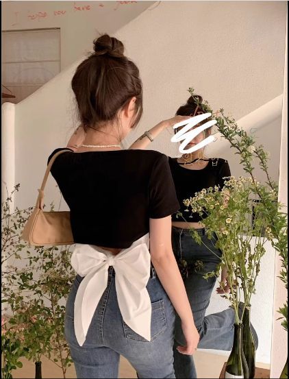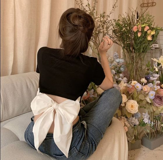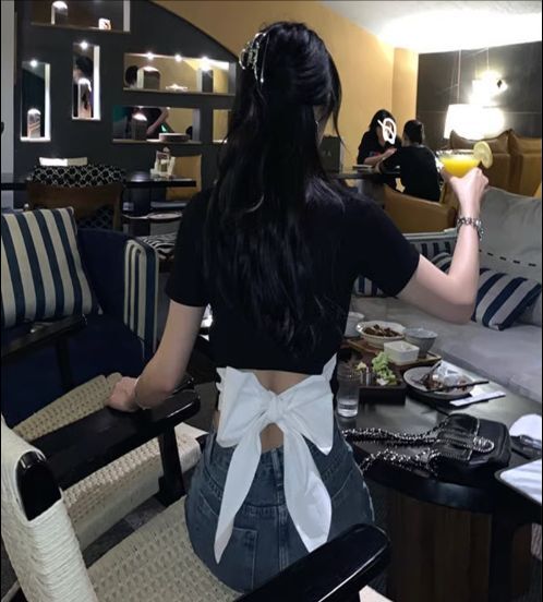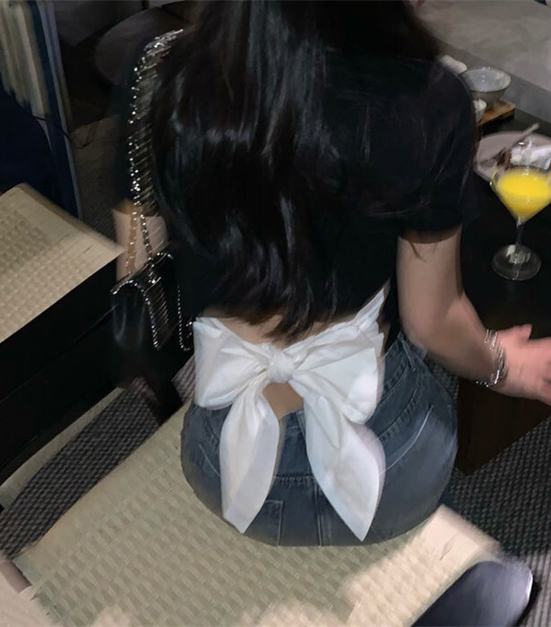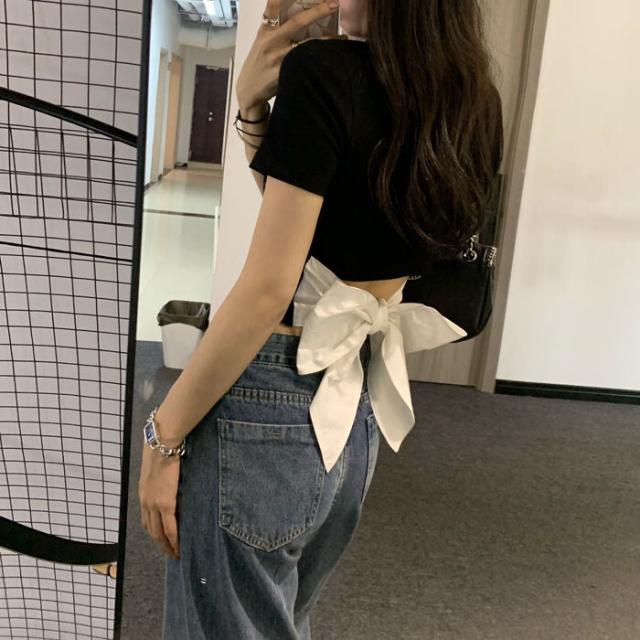 トップス レディース 半袖カットソー クルーネック 襟なし クロップド丈 ショート丈 バックリボン バックシャン 大人可愛い シンプル カジュアル おしゃれ お洒落 キュート ガーリー ラブリー かっこいい 存在感 抜け感 S M L ブラック 黒 春 夏 秋 10代 20代 30代 40代 お出かけ 女子会 イベント 休日 旅行 リゾート 普段使い デイリー 韓国 オルチャン プレゼント ギフト