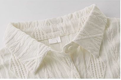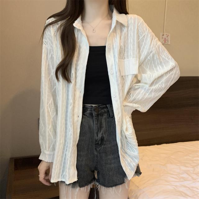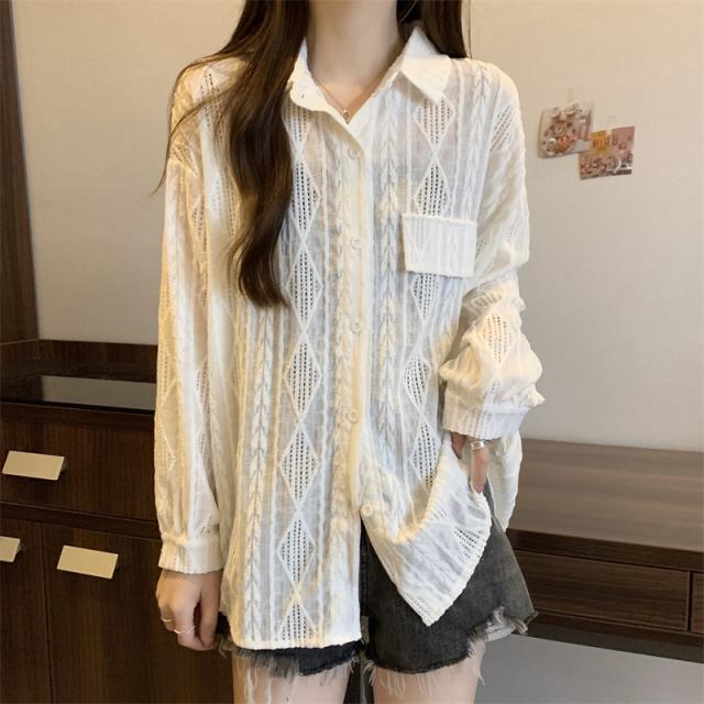 トップス レディース 白シャツ ブラウス 白トップス 羽織り 日焼け防止 紫外線予防 冷房対策 長袖 ボタン 前開き ボタン 襟付き 透け感 透かし模様 幾何学模様 大人可愛い おしゃれ お洒落 かっこいい きれいめ シンプル カジュアル 大人 上品 エレガント 存在感 抜け感
