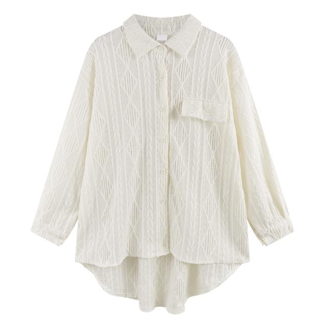 トップス レディース 白シャツ ブラウス 白トップス 羽織り 日焼け防止 紫外線予防 冷房対策 長袖 ボタン 前開き ボタン 襟付き 透け感 透かし模様 幾何学模様 大人可愛い おしゃれ お洒落 かっこいい きれいめ シンプル カジュアル 大人 上品 エレガント 存在感 抜け感 こなれ感 S M L XL 白 アイボリー 春 夏 秋 10代 20代 30代 40代 50代 60代 お出かけ 学生 公園デビュー 女子会 旅行 リゾート 休日 普段使い デイリー 学生 通学 アウトドア 韓国 オルチャン