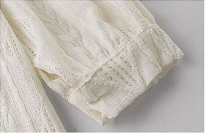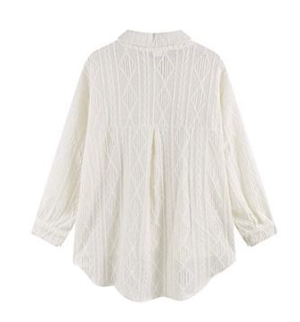 ホワイトカラーの幾何学透かし模様長袖シャツブラウス。