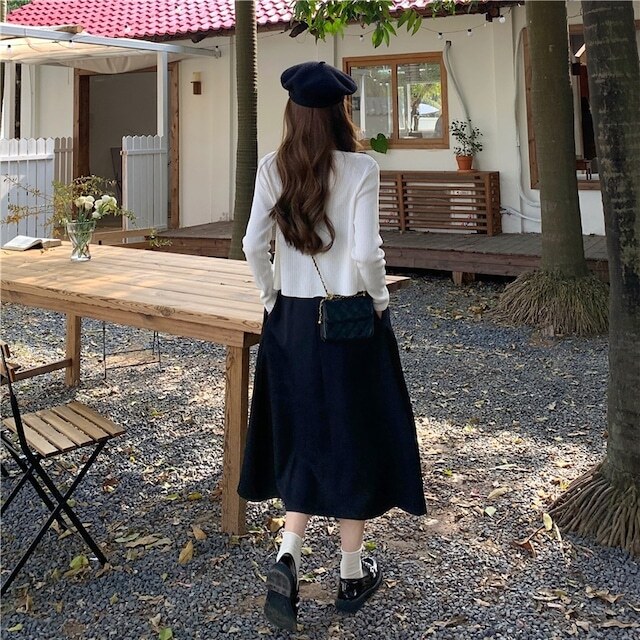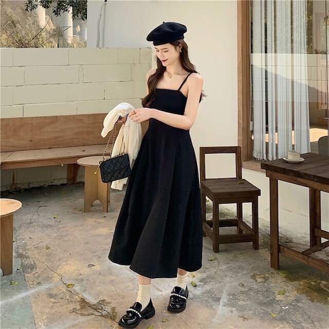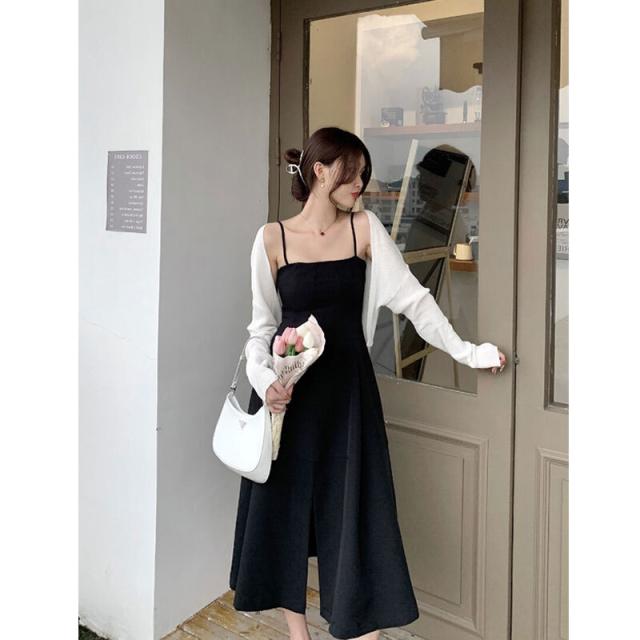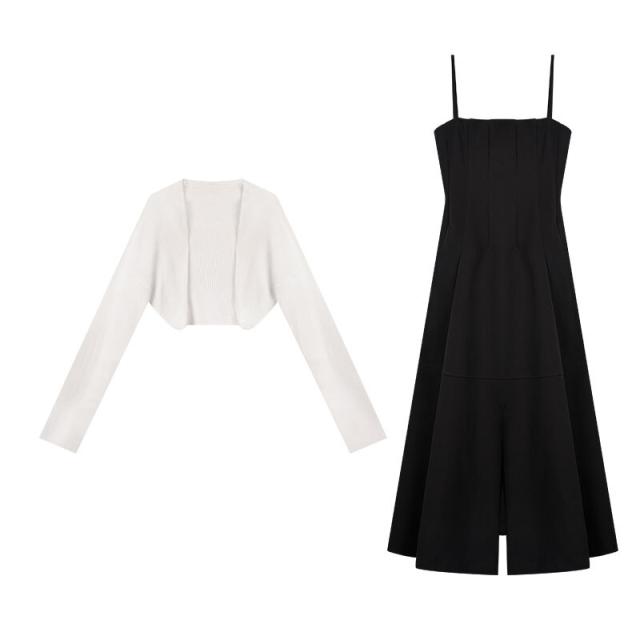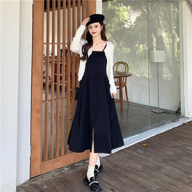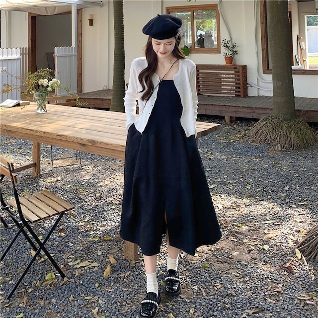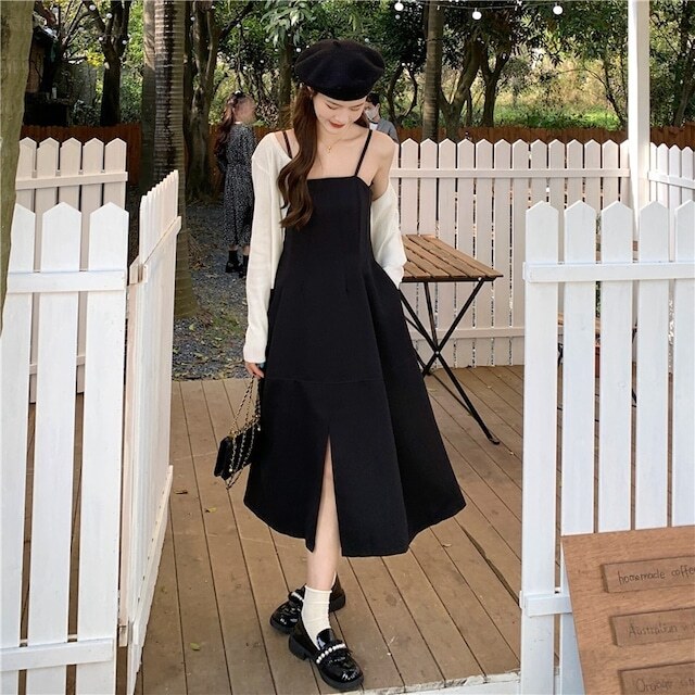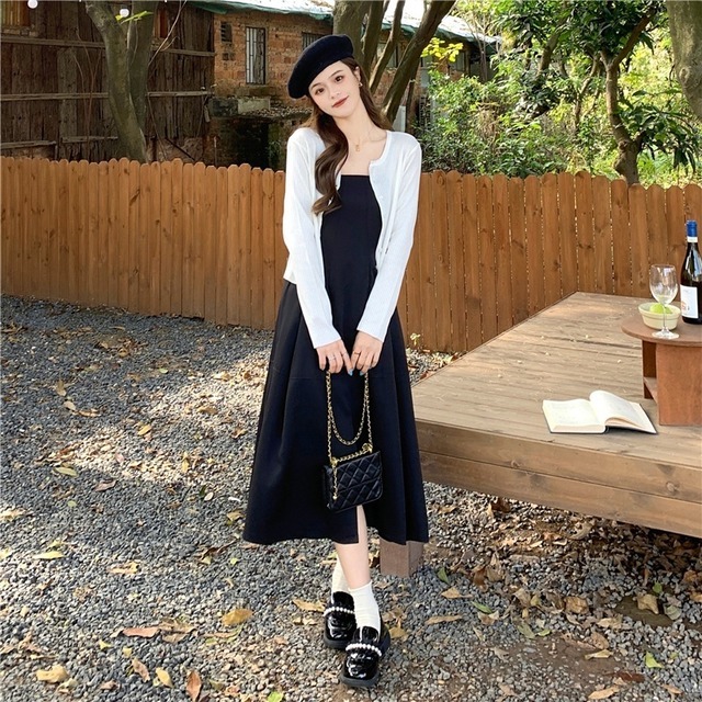 長袖カーディガンとミモレ丈キャミソールワンピースの2点セット。