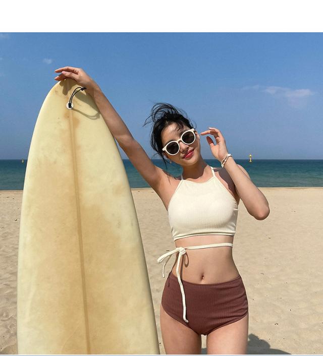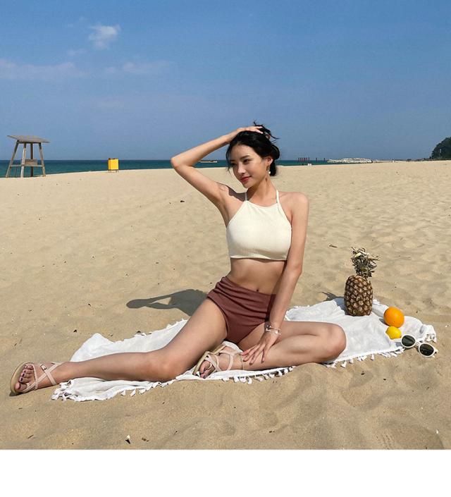 バイカラーホルターネックセパレートビキニ水着。