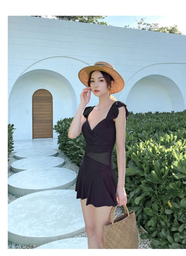水着 スイムウエア レディース ワンピース カシュクール フリル 半袖 スカート 胸元 谷間魅せ 盛れる 大人可愛い きれいめ セクシー sexy おしゃれ お洒落 シンプル ナチュラル 大人 大人っぽい 華やか レトロ 主役級 存在感 女っぽ M L XL 2XL 黒 ブラック 緑 グリーン