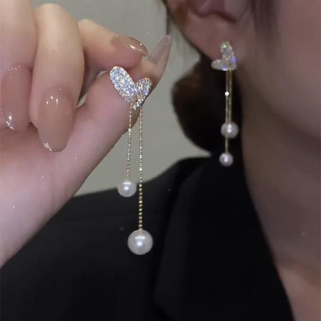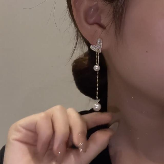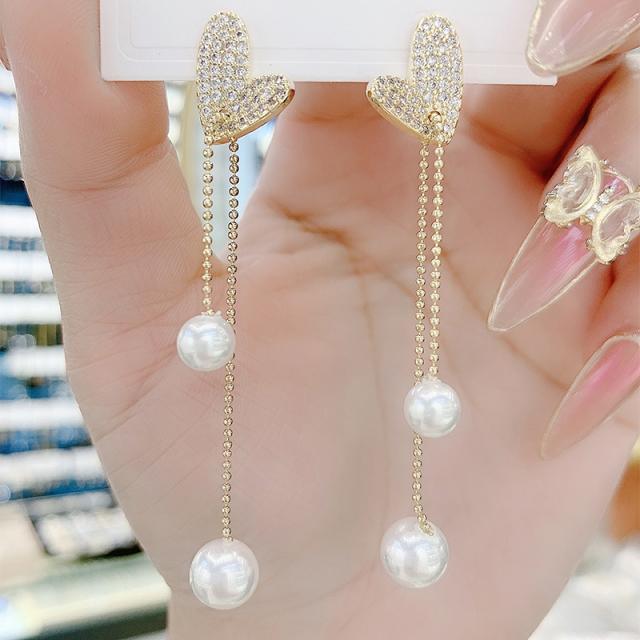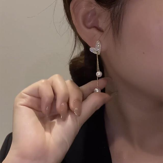 パヴェのハートとゆらゆら揺れる一粒パールがカワイイピアス。