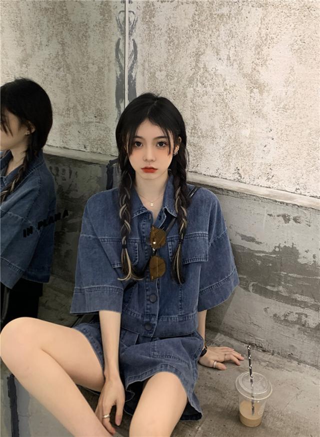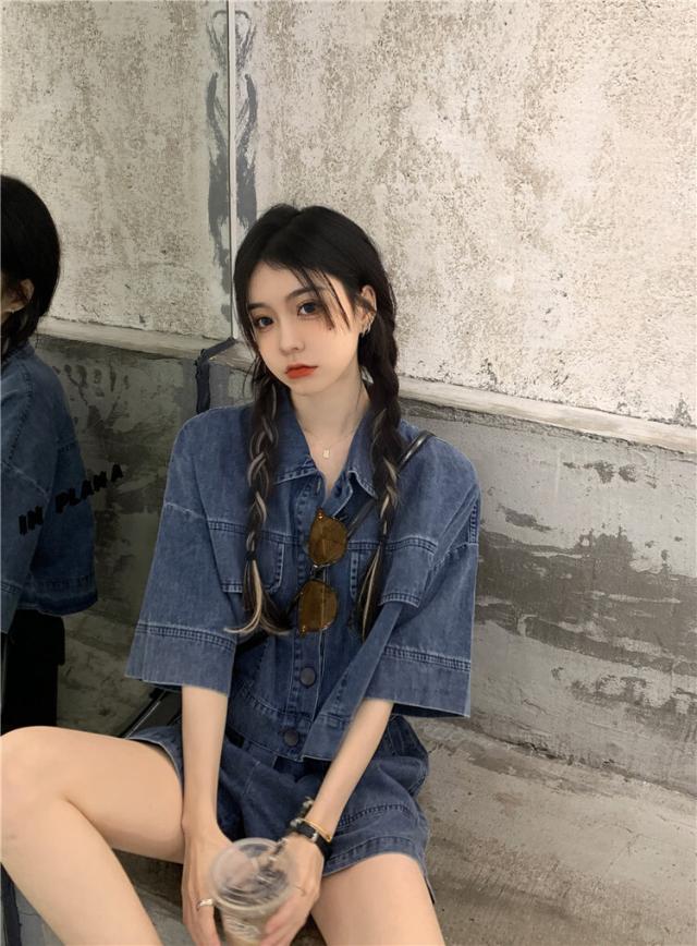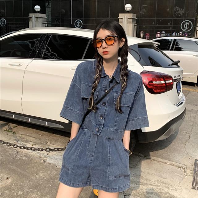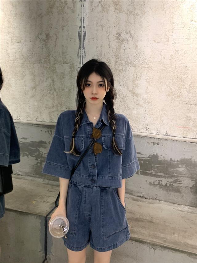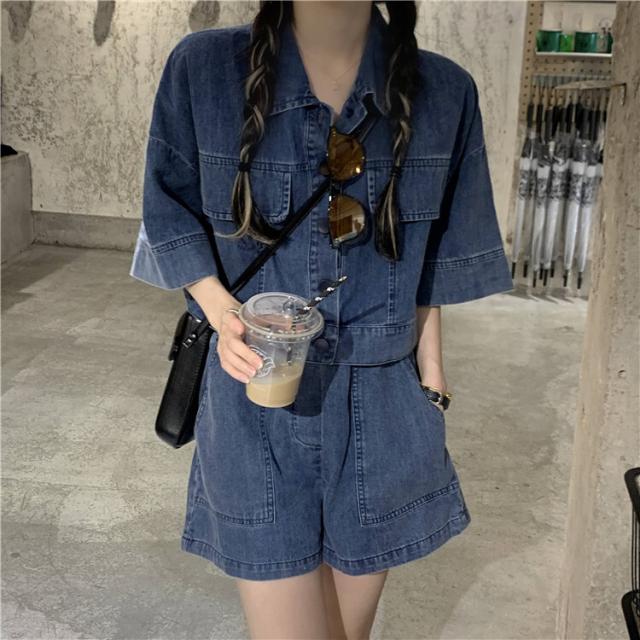 デニム素材の半袖シャツとショートパンツのセットアップ。