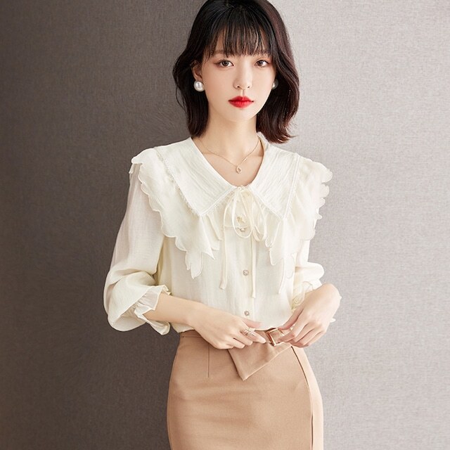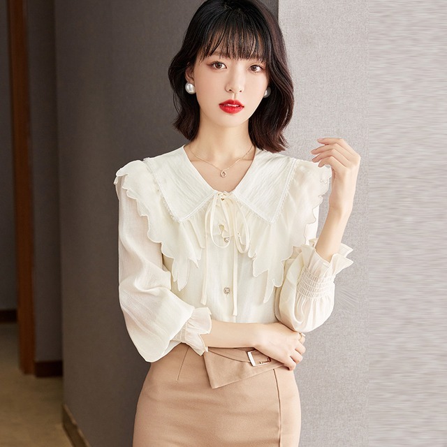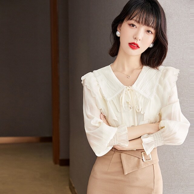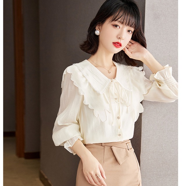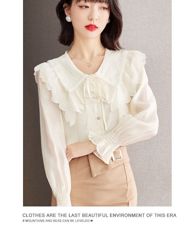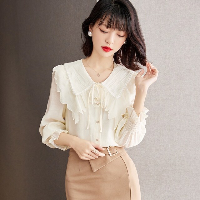 トップス レディース シャツ ブラウス 長袖 フリル襟 ボタン 前開き リボン かわいい 大人可愛い おしゃれ お洒落 きれいめ 大人 上品 エレガント フェミニン ガーリー ラブリー キュート 大人女子 存在感 抜け感 こなれ感 S M L XL ベージュ 無地 春 夏 秋 10代 20代 30代 40代 50代 ビジネス オフィス OL 通勤 学生 通学 お出かけ 女子会 デート 旅行 リゾート 休日 普段使い デイリー 韓国 オルチャン モテ