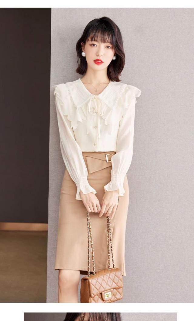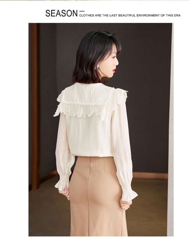 ベージュカラーのフリル襟長袖シャツブラウス。