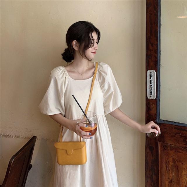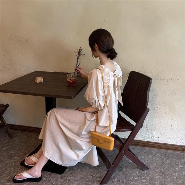 ワンピース レディース 半袖 パフスリーブ ボリューム袖 ランタンスリーブ 襟なし スクエアネック ロング丈 バックリボン ギャザー ゆったり 大人可愛い シンプル カジュアル 大人 上品 おしゃれ お洒落 大人女子 こなれ感 ルーズ 抜け感 存在感 ワンサイズ フリーサイズ 白