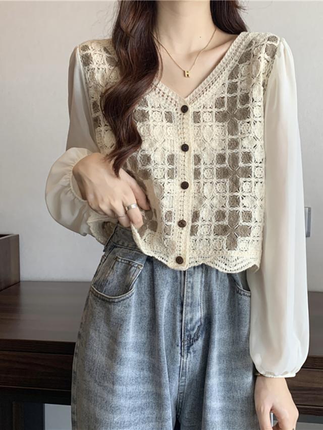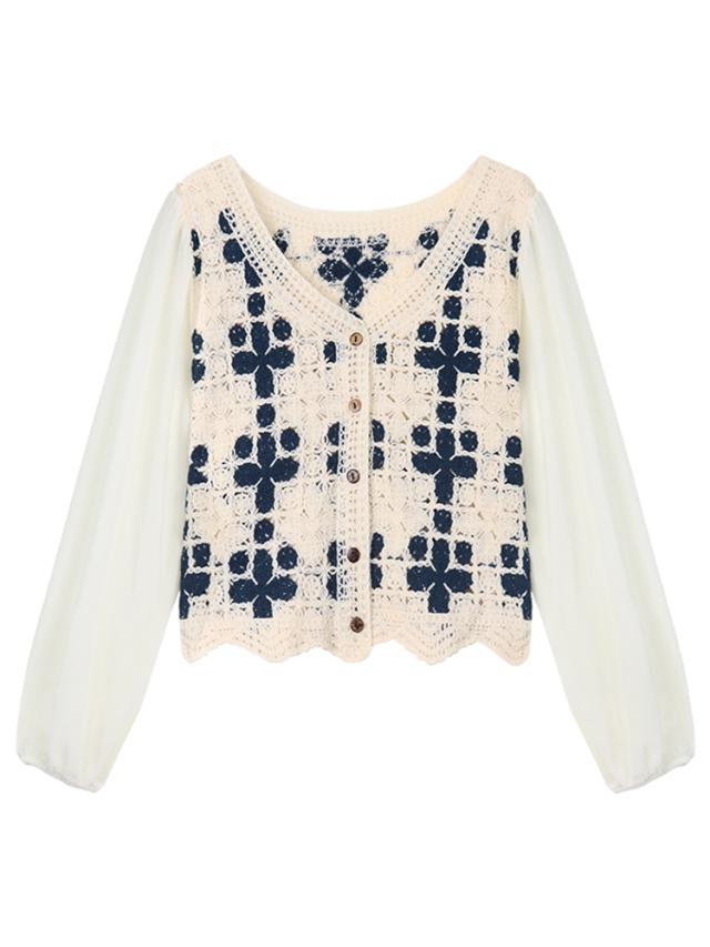 トップス レディース ニットカーディガン クロップド丈 長袖 Vネック ボリューム袖 パフスリーブ シフォン袖 異素材MIX クロシェ編み かわいい 大人可愛い おしゃれ お洒落 レトロ 大人女子 こなれ感 キュート 存在感 抜け感 フリーサイズ ワンサイズ 春 秋 10代 20代 30代 40代 フラワー 花柄 グレー 灰色 ブラウン 茶色 紺 ネイビー 学生 通学 お出かけ 公園デビュー 休日 旅行 普段使い アウトドア デイリー 重ね着 定番 着回し