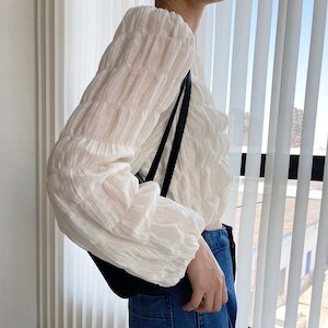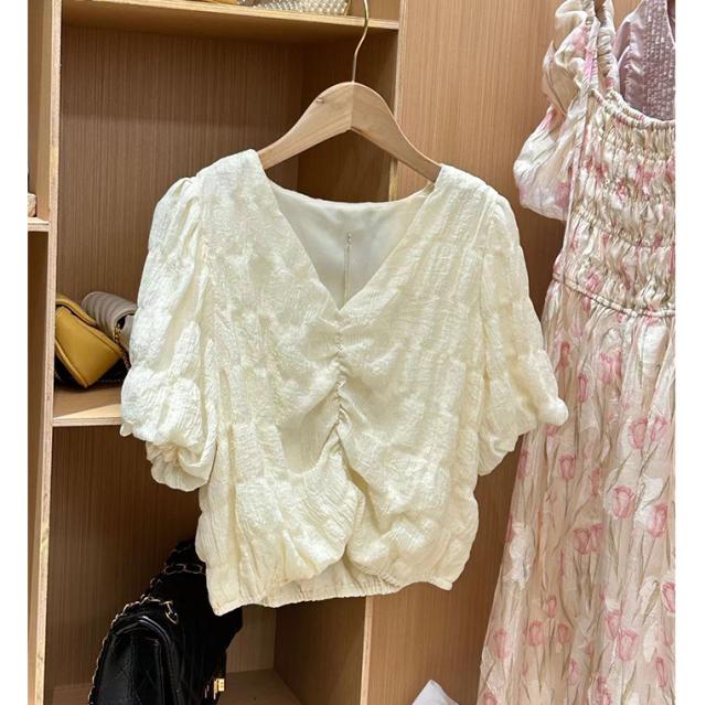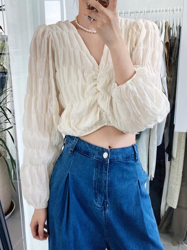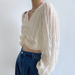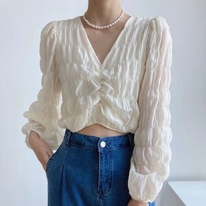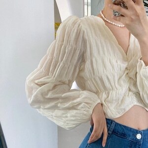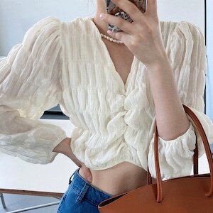 トップス レディース シフォンブラウス カットソー プルオーバー クロップド丈 Vネック シャーリング 長袖 襟なし パフスリーブ 大人可愛い きれいめ 大人 上品 おしゃれ お洒落 存在感 大人女子 かっこいい こなれ感 抜け感 ふんわり 個性的 クール フェミニン 体型カバー M L 白 アイボリー 無地 春 夏 秋 10代 20代 30代 40代 50代 60代 デート お出かけ 女子会 休日 旅行 普段使い デイリー 韓国 オルチャン 着回し デート